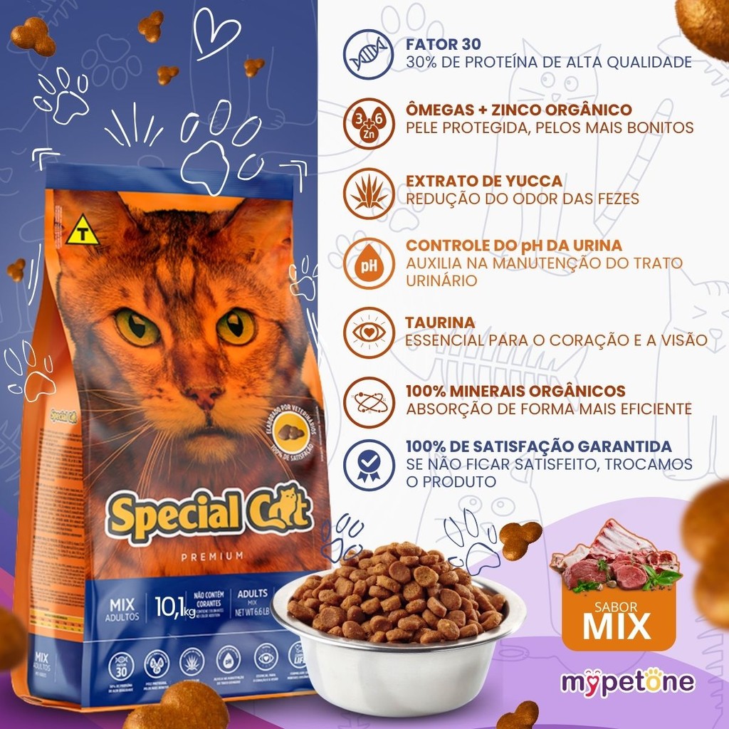 Special Cat Mix Adultos - 10,1Kg - Não contém corantes artificiais - Ômegas 3 e 6 + Zinco Orgânico: contribui para a proteção da pele e pelos mais bonitos - Controle do pH da urina: trato urinário saudável - Este produto possui 100% Satisfação Garantida. Solicitações devem ser encaminhadas diretamente para o fabricante. Informações Special Cat Mix para Gatos Adultos é um alimento completo e balanceado, livre de corantes artificiais, possui minerais orgânicos que melhoram a absorção dos nutrientes. Contém Extrato de Yucca que contribui para redução do odor das fezes, além do controle do pH da urina, mantendo o trato urinário saudável. Quantidade Diária Recomendada Composição Básica Farinha de vísceras de aves, farinha de carne e ossos de bovinos, arroz quebrado, milho moído*, resíduo seco de destilaria (milho*), farelo de soja*, óleo de aves, levedura de cana-de-açúcar inativada e desidratada, biomassa de microalgas desidratada (Schizochytrium sp.), extrato de Yucca schidigera (0,05%), hidrolisado de fígado de aves e suínos, regulador de acidez, antioxidantes (BHA e BHT), DL- metionina, taurina, cloreto de sódio, cloreto de potássio, vitamina A, vitamina D3, vitamina E, vitamina K3, vitamina B1, vitamina B2, vitamina B6, vitamina B12, vitamina C, niacina, cloreto de colina, ácido pantotênico, ácido fólico, biotina, iodato de cálcio, cobre aminoácido quelato, ferro aminoácido quelato, manganês aminoácido quelato, zinco aminoácido quelato, levedura enriquecida com selênio, propionato de amônio, sorbato de potássio, parede celular de levedura. *Agrobacterium tumefaciens, Bacillus thuringiensis, Streptomyces viridochromogenes. Enriquecimento por Kg do Produto Vitamina A 15.000 UI, vitamina D3 540 UI, vitamina E 120 UI, vitamina K3 1,8 mg, vitamina B1 7,95 mg, vitamina B2 6,6 mg, vitamina B6 9 mg, vitamina B12 105 μg, vitamina C 15 mg, niacina 81 mg, colina 2.160 mg, ácido pantotênico 21 mg, ácido fólico 1,13 mg, biotina 150 μg, cobre 10 mg, ferro 84 mg, iodo 1,8 mg, manganês 20 mg, selênio 0,4 mg, zinco 97,5 mg Níveis de Garantia Umidade máx. 100 g/kg 10% Proteína Bruta mín. 300 g/kg 30% Extrato Etéreo mín. 120 g/kg 12% Matéria Mineral máx. 80 g/kg 8% Matéria Fibrosa máx. 30 g/kg 3% Cálcio máx. 16 g/kg 1,6% Cálcio mín. 8.000 mg/kg 0,8% Fósforo mín. 8.000 mg/kg 0,8% Sódio mín. 2.000 mg/kg 0,2% Potássio mín. 6.000 mg/kg 0,60% DL-metionina mín. 7.000 mg/kg 0,7% Taurina mín. 1.000 mg/kg 0,1% Ômega 6 mín. 20 g/kg 2% Ômega 3 mín. 3.000 mg/kg 0,3% pH Urinário 6,2 – 6,8 Energia Metabolizável 3.900 kcal/kg Indicação: Gatos Adultos Sabor: Mix de carne + espinafre desidratado Trânsgênico: Sim