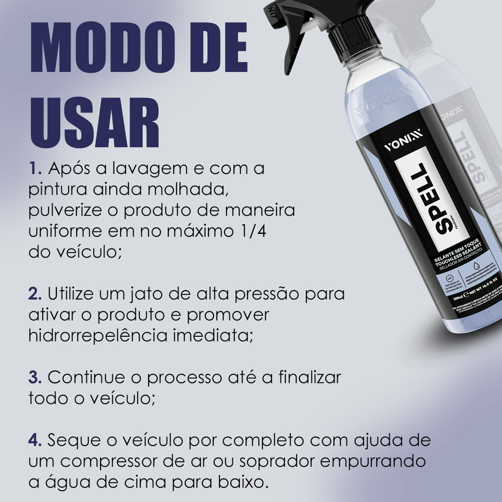 >>>>>>SELANTE SEM TOQUE À BASE DE SÍLICA SPELL 2.0 VONIXX<<<<<< Conteúdo da Embalagem: 01 (Um) Selante sem toque hidrorrepelente; Spell Spray 500ml Vonixx; **Imagens e vídeo do anúncio são reais. Spell é um selante sem toque, à base de sílica, que age imediatamente ao ser aplicado. Promove hidrorrepelência imediata, criando um filme de brilho e proteção UVA e UVB na pintura plástico, vidros e rodas. Proteja seu veículo com a alta performance de Spell e sua tecnologia avançada. PROTEÇÃO UV HIDRORREPELÊNCIA IMEDIATA MODO DE USO: 1. Após a lavagem e com a pintura ainda molhada, pulverize o produto de maneira uniforme em no máximo 1/4 do veículo. 2. Utilize um jato de alta pressão para ativar o produto e promover hidrorrepelência imediata. 3. Continue o processo até a finalizar todo o veículo. 4. Seque o veículo por completo com ajuda de um compressor de ar ou soprador empurrando a água de cima para baixo.