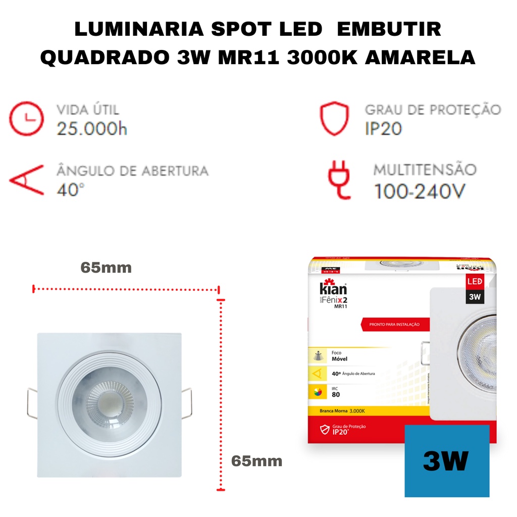 O Spot de Led de Embutir Quadrado da Kian é indicado para ambientes comerciais e residenciais. Pode ser utilizado para substituir spots equipados com lâmpadas e também luminárias embutidas em ambientes que requerem um clima agradável e foco de luz em pontos específicos. É uma solução ideal para ambientes comerciais trazendo visibilidade para produtos em exposição, vitrines, lojas e demais locais de exibição de objetos. Características: - Iluminação de altíssima qualidade, deixando qualquer ambiente aconchegante e moderno. - Alta economia de energia, representando até 80%. - Longa vida útil, chegando em 50.000 horas. - Descarte não prejudicial ao meio ambiente, devido não emitir raio ultravioleta, nem infravermelho.