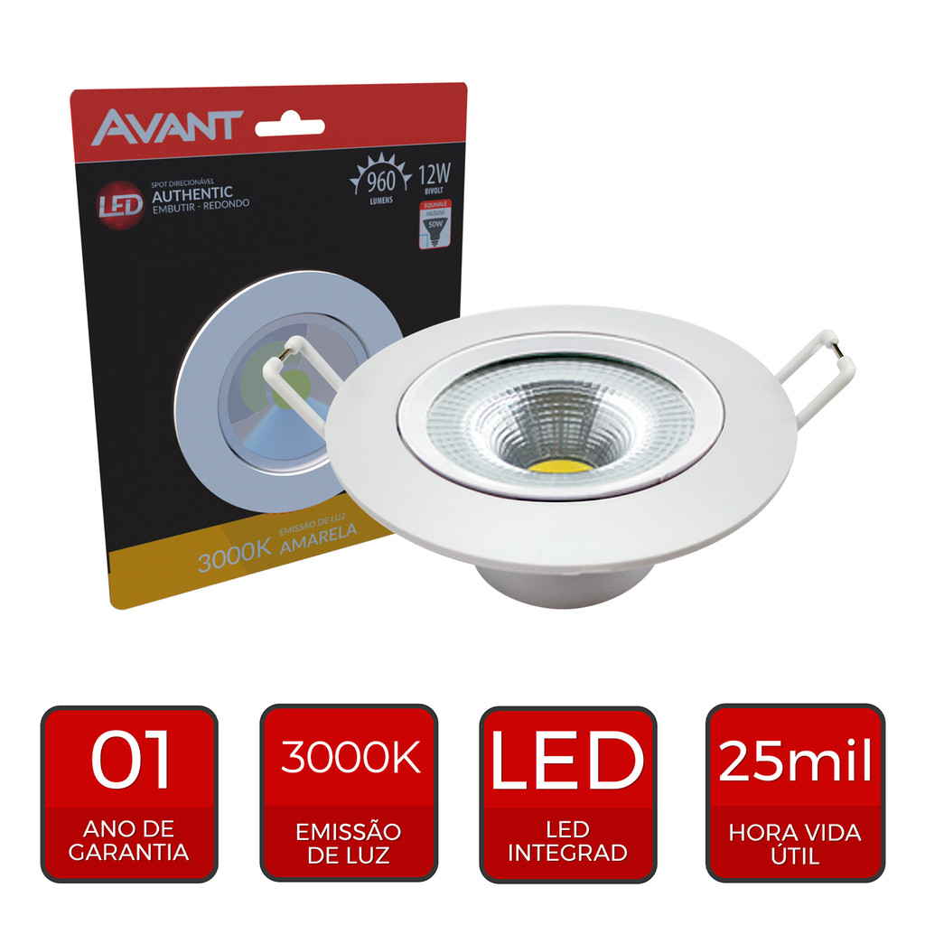 SPOT AUTHENTIC 12W - Iluminação de Destaque com Luz Amarelada O SPOT AUTHENTIC 12W é a escolha perfeita para iluminar e destacar objetos e texturas em ambientes internos, sejam eles residenciais ou comerciais. Com design moderno e funcional, ele oferece um sistema direcionável para ajustar o ângulo da luz de acordo com a sua necessidade, proporcionando uma luz amarelada aconchegante que cria uma atmosfera relaxante e acolhedora. PROPRIEDADES: Construção livre de mercúrio. Ajuste manual de direção da luz. Acabamento em policarbonato na cor branca. Baixo consumo de energia. CARACTERÍSTICAS DE FUNCIONAMENTO: Temperatura ambiente: -5°C a 40°C. Tensão de entrada: 100V a 240V. Fator de potência: >0,50. Tipo de Instalação: Embutido. ESPECIFICAÇÕES TÉCNICAS E COMERCIAIS: Código: 281070574 Descrição Comercial: LED-SPOT-AUTHENTIC-EMB-RED-AM3000K-12W-BIVOLT-960 Fluxo Luminoso: 960 lm Candelas: 1910 cd Eficiência de Emissão Luminosa: 80 lm/W Temperatura de Cor: 3000K (Branco Quente) Dimensões (mm): Ø140 x Ø140 x 35 Nicho de Corte (mm): Ø120mm Peso (g): 162 Garantia: 12 meses (contra defeitos de fabricação) SOBRE A MARCA AVANT A Avant é uma marca reconhecida no mercado de iluminação por oferecer produtos de alta qualidade, design moderno e tecnologia inovadora. Com foco na sustentabilidade, a Avant utiliza materiais ecologicamente corretos e oferece soluções eficientes para o consumo de energia, contribuindo para um futuro mais sustentável.