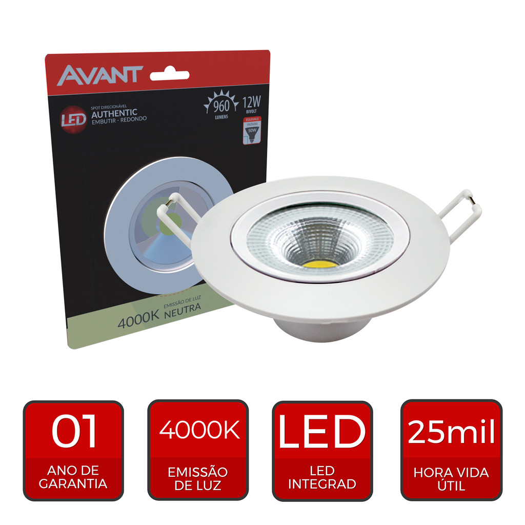 SPOT AUTHENTIC 12W - Iluminação de Destaque com Luz Neutra O SPOT AUTHENTIC 12W é a escolha perfeita para iluminar e destacar objetos e texturas em ambientes internos, sejam eles residenciais ou comerciais. Com design moderno e funcional, ele oferece um sistema direcionável para ajustar o ângulo da luz de acordo com a sua necessidade, proporcionando uma luz neutra que realça a beleza natural dos espaços. PROPRIEDADES: Construção livre de mercúrio. Ajuste manual de direção da luz. Acabamento em policarbonato na cor branca. Baixo consumo de energia. CARACTERÍSTICAS DE FUNCIONAMENTO: Temperatura ambiente: -5°C a 40°C. Tensão de entrada: 100V a 240V. Fator de potência: >0,50. Tipo de Instalação: Embutido. ESPECIFICAÇÕES TÉCNICAS E COMERCIAIS: Código: 281080870 Descrição Comercial: LED-SPOT-AUTHENTIC-EMB-RED-NE4000K-12W-BIVOLT-960 Fluxo Luminoso: 960 lm Candelas: 1910 cd Eficiência de Emissão Luminosa: 80 lm/W Temperatura de Cor: 4000K (Luz Neutra) Dimensões (mm): Ø140 x Ø140 x 35 Nicho de Corte (mm): Ø120mm Peso (g): 162 Garantia: 12 meses (contra defeitos de fabricação) SOBRE A MARCA AVANT A Avant é uma marca reconhecida no mercado de iluminação por oferecer produtos de alta qualidade, design moderno e tecnologia inovadora. Com foco na sustentabilidade, a Avant utiliza materiais ecologicamente corretos e oferece soluções eficientes para o consumo de energia, contribuindo para um futuro mais sustentável.
