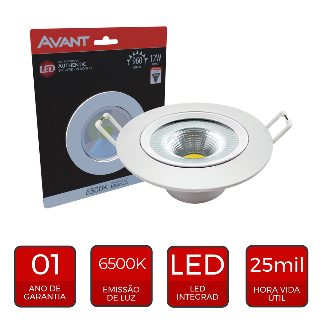 SPOT AUTHENTIC 12W - Iluminação de Destaque com Luz Branca Fria O SPOT AUTHENTIC 12W é a escolha perfeita para iluminar e destacar objetos e texturas em ambientes internos, sejam eles residenciais ou comerciais. Com design moderno e funcional, ele oferece um sistema direcionável para ajustar o ângulo da luz de acordo com a sua necessidade, proporcionando uma luz branca fria que realça a modernidade e a sofisticação dos espaços. PROPRIEDADES: Construção livre de mercúrio. Ajuste manual de direção da luz. Acabamento em policarbonato na cor branca. Baixo consumo de energia. CARACTERÍSTICAS DE FUNCIONAMENTO: Temperatura ambiente: -5°C a 40°C. Tensão de entrada: 100V a 240V. Fator de potência: >0,50. Tipo de Instalação: Embutido. ESPECIFICAÇÕES TÉCNICAS E COMERCIAIS: Código: 281091371 Descrição Comercial: LED-SPOT-AUTHENTIC-EMB-RED-BR6500K-12W-BIVOLT-960 Fluxo Luminoso: 960 lm Candelas: 1910 cd Eficiência de Emissão Luminosa: 80 lm/W Temperatura de Cor: 6500K (Luz Branca Fria) Dimensões (mm): Ø140 x Ø140 x 35 Nicho de Corte (mm): Ø120mm Peso (g): 162 Garantia: 12 meses (contra defeitos de fabricação) SOBRE A MARCA AVANT A Avant é uma marca reconhecida no mercado de iluminação por oferecer produtos de alta qualidade, design moderno e tecnologia inovadora. Com foco na sustentabilidade, a Avant utiliza materiais ecologicamente corretos e oferece soluções eficientes para o consumo de energia, contribuindo para um futuro mais sustentável.