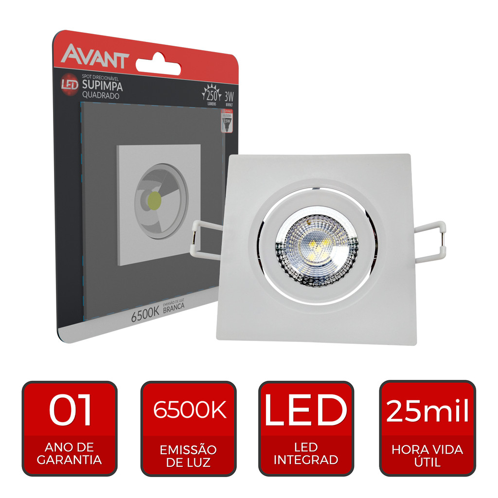 Spot Led Authentic Embutir 3w 6500k Branco Frio 7cm 110v/220v Bivolt Ip20 Quadrado Branco Cod: 865441376 Avant