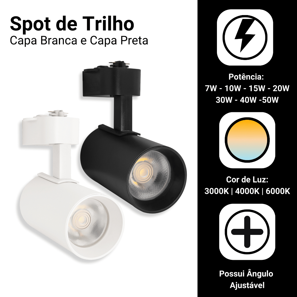 Spots Para Trilho Led Luz Branco Quente, Neutro ou Frio Branco ou Preto Bivolt