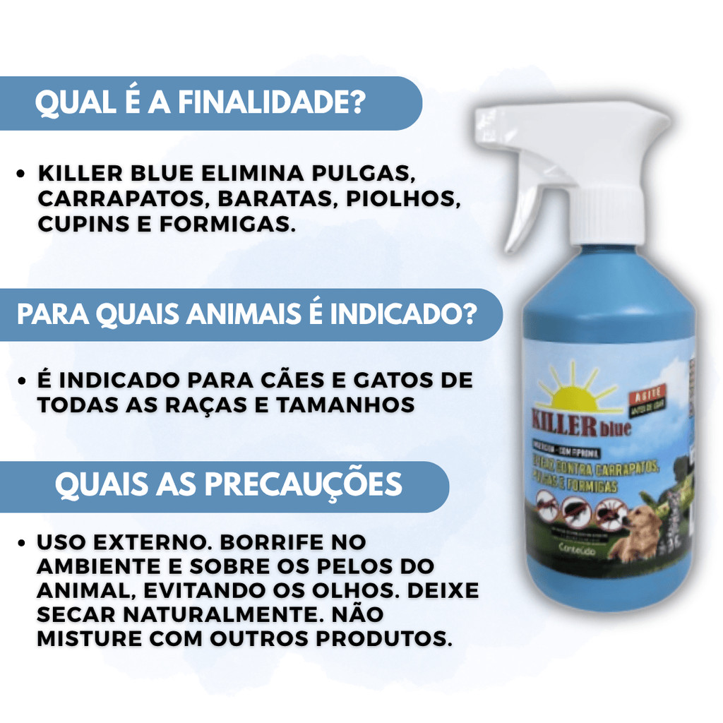 KILLER BLUE SPRAY 250ML - ANTI-PULGAS, CARRAPATOS, PIOLHO, ENTRE OUTROS!!! BENEFÍCIOS - Para controle e dedetização de pulgas, carrapatos, baratas, cupins, formigas e piolhos. - Para ambientes internos e externos em residências, comércios e indústrias. - Elimina completamente em Cães e Gatos pulgas, carrapatos e piolhos. - Duração testada e garantido. - Produto seguro, com fórmula desenvolvida por laboratório de inseticida. Diga adeus às pulgas saltitantes, aos carrapatos teimosos, às baratas assustadoras, às formigas invasoras, aos piolhos persistentes e aos cupins destrutivos! Apresentamos a você o poderoso e eficiente Killer 250 ml, o inseticida revolucionário que resolve todos os seus problemas de infestação! Com o Killer 250 ml, você pode finalmente desfrutar de um ambiente livre de pragas. Seu poderoso efeito residual garante que pulgas, carrapatos, baratas, formigas, piolhos e cupins sejam combatidos e eliminados sem piedade. Sua casa, escritório ou qualquer lugar onde aplicado se tornará uma zona de segurança para você, sua família e seus animais de estimação. Além de ser altamente eficaz no controle de pragas em ambientes, o Killer 250 ml é a solução definitiva para proteger seus amados cães e gatos. Pulgas, carrapatos e piolhos serão erradicados em um piscar de olhos, proporcionando alívio imediato aos seus animais de estimação. Agora, você pode desfrutar de momentos de qualidade e carinho sem a preocupação com essas pragas incômodas. Se você está cansado de batalhar contra pulgas, carrapatos, baratas, formigas, piolhos e cupins, é hora de escolher o melhor: o Killer 250 ml! Sua eficácia comprovada, ação rápida e segurança garantida fazem dele a solução definitiva para o controle de pragas. Desfrute de um ambiente livre de insetos indesejados e proporcione conforto total aos seus amados animais de estimação. Não espere mais, experimente o Killer 250 ml agora mesmo e diga adeus às pragas de uma vez por todas! COMO USAR Para Cães e Gatos: Pulverizar o produto no sentido contrário ao crescimento dos pelos. Para que o tratamento seja eficaz deve borrifar todo o corpo do animal até umedecer bem sua pele e pelo, e suas partes mais quentes como pescoço, em baixo dos braços patas e caudas. Para Ambientes: Aplicar no ambiente afetado, pulverizando em todo ambiente infestado. Aguardar a ação do produto. PRECAUCÕES Não aplicar sobre alimentos, utensílios domésticos de cozinha e aquários. APRESENTAÇÃO 01 frasco com 250 ml