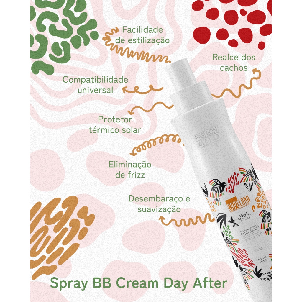 O Spray BB Cream Day After é o produto perfeito para você que busca revitalizar e realçar a beleza dos seus cabelos entre as lavagens. Se você já acordou com os fios desalinhados e rebeldes, sabe como pode ser desafiador começar o dia assim. Mas não se preocupe! O Spray BB Cream entra em ação imediatamente para transformar seu dia, proporcionando uma modelagem perfeita dos cachos e economizando tempo e esforço no seu cuidado dos fios. Com uma textura leve e fluida, o Spray BB Cream não só desembaraça os fios, mas também os torna mais maleáveis e macios, eliminando o frizz e facilitando o cuidado dos cachos. Diga adeus aos dias de luta com o cabelo e olá a uma rotina mais prática e eficiente! Sua fórmula é enriquecida com poderosos ingredientes como óleo de Marula e Manketti, além de óleo de semente de crambe e extrato de semente de linhaça. Esses componentes naturais penetram profundamente nas cutículas capilares, proporcionando uma hidratação e nutrição intensas. O resultado é uma superfície capilar mais uniforme e brilhante, sem acúmulo de resíduos indesejados. Mas isso não é tudo! O Spray BB Cream também oferece proteção contra danos solares térmicos, garantindo que seus cachos permaneçam saudáveis e bonitos a cada dia. Experimente a diferença que esse produto incrível pode fazer e desfrute de cachos sempre perfeitos e radiantes, prontos para arrasar em qualquer ocasião! Modo de uso: 01 Aplique uma pequena quantidade de Capulana BB Cream nos cabelos úmidos, distribuindo uniformemente da raiz às pontas; 02 Penteie ou modele os cachos conforme desejado; 03 Deixe secar naturalmente ou use um difusor para um resultado mais definido; 04 Para reativar os cachos no dia seguinte, aplique uma pequena quantidade nos cabelos secos e amasse suavemente. Itens inclusos: 01 - Spray BB Cream 300ml - Capulana