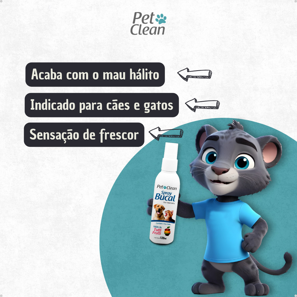 PERGUNTAS FREQUENTES O SPRAY É INDICADO TANTO PARA CÃES QUANTO PARA GATOS? Sim! A aplicação é a mesma tanto para cães quanto para gatos de todas as raças e portes. O QUE FAZER SE APLICAR NOS OLHOS POR ACIDENTE? Em caso de contato com os olhos, você deverá enxaguar o seu animal em abundância. O SPRAY BUCAL TEM RESTRIÇÕES DE IDADE? Sim! Não é recomendado o uso do spray bucal em filhotes com menos de 2 meses da idade. Promova a saúde bocal e o bom hálito do seu peludinho! Cachorros e gatos limpos e cheirosos são grandes desejos de todos os amantes de animais, não é mesmo? E para uma boa higiene inclui-se também a saúde bocal! O hábito da higiene bucal dos animais é fundamental para prevenir o mau hálito, tártaro e placas, além de prevenir infecções e bactérias que podem ser prejudiciais a saúde do seu pet. O Spray Bucal para Cães e Gatos Pet Clean é uma ótima opção para você que quer ver o seu pet com uma boa saúde bocal ao mesmo tempo que tem um hálito agradável! BENEFÍCIOS DO SPRAY BUCAL PET CLEAN: - Neutraliza odores e evita mau hálito. - Proporciona frescor à boca do animal. - Aroma agradável de menta. - Indicado para cães e gatos. INFORMAÇÕES TÉCNICAS: Produto: Spray Bucal para Cães e Gatos Pet Clean 120 ml Marca: Pet Clean Tipo: Higiene Animal: Cachorros e Gatos Porte: Pequeno, Médio e Grande. Acima de 2 meses. Raça Específica: Não Sexo Específico: Não Itens Inclusos: 1 Spray Bucal para Cães e Gatos Pet Clean 120 ml Apresentação: Frasco em Plástico Composição: Conservante, Aroma e Veículo. MODO DE USAR Pulverize diretamente na boca do animal durante o dia. Recomendado até 5 aplicações por dia. PRECAUÇÕES Evite contato com os olhos e mucosas do animal. Manter longe de alimentos e produtos domésticos. Manter em locais secos, fora do alcance de crianças e animais domésticos. Não utilizar em filhotes com menos de 2 meses de vida.