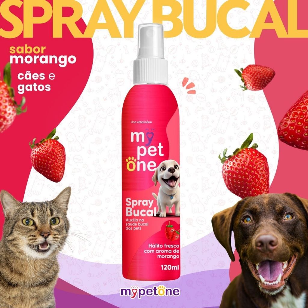 Spray Bucal Morango Mypetone - 120mL - Evita o mau hálito; - Sabor Morango; - Sensação de frescor. Detalhes O Spray Bucal Morango Mypetone, é um produto desenvolvido para eliminar e evitar o mau-hálito comum em Pet domésticos. Além de deixar um agradável aroma de Morango na boca do seu Pet. Dicas Especiais Depois de um banho em seu pet, deixe ele bem penteado, mas não esqueça de deixá-lo com um hálito agradável para não espantar as visitas. O Spray Bucal Mypetone Sabor Morango vai ajudar o seu cão ou gato a não ter aquele cheiro desagradável na boca. Um produto sem química ou substâncias agressivas ao organismo do pet. Indicação: Cachorros, Gatos Porte/Raça: Raças Pequenas, Raças Médias, Raças Grandes Idade: Filhotes, Adultos, Idosos Composição: Água, aroma e benzoato de sódio. Apresentação: 120mL