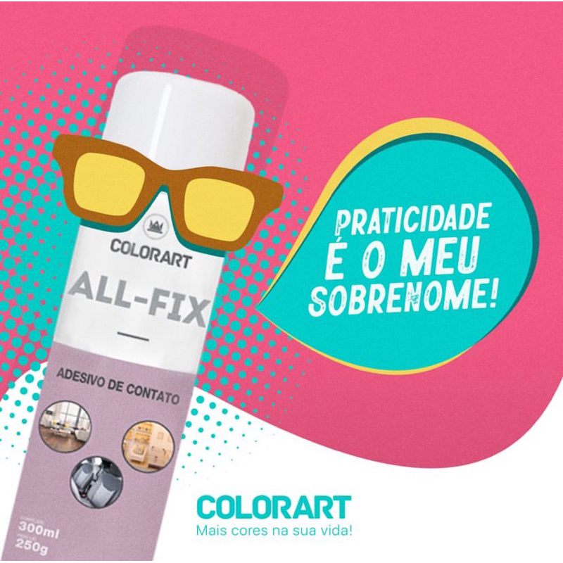 Seja(o) bem vinda(o) à Loja do Sr.Martelo! ALL-FIX ADESIVO REPOSICIONÁVEL (LEVE) Cola temporária em spray que fixa materiais leves, como papel, stencil e fotos. Sua aplicação é precisa e sem desperdícios. Indicado para fixação temporária de máscaras para pintura, fixação de cartazes, tecidos para silk screen, fixação para costuras, etc. ALL-FIX ADESIVO DE CONTATO (MÉDIA) Colorart ALL-FIX - Adesivo de Contato é uma cola em spray com alto rendimento, que proporciona rapidez e praticidade na colagem. É indicada para a colagem de espumas P.U. entre si, ou com madeira, tecidos, bancos e tetos de automóveis e etc. ALL-FIX ADESIVO DE ALTA ADERÊNCIA (FORTE) Cola em spray que garante forte aderência em diversos materiais. Indicado para fixação de borrachas, couro, espuma, cortiça, plástico e etc. Obrigado pela visita e ótimas compras! Att, Sr.Martelo