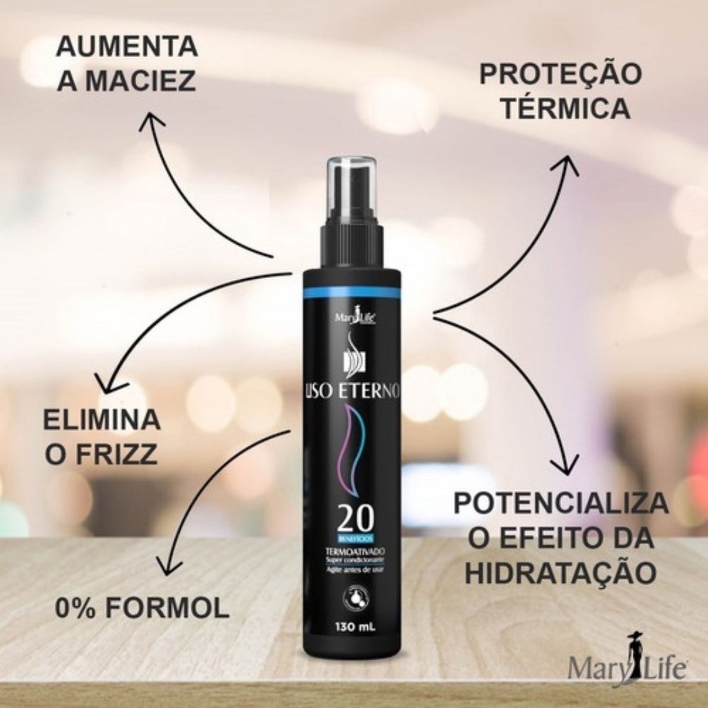 Spray Condicionante Termoativado Liso Eterno 20 Benefícios Mary Life 130 ml Liso Eterno Spray Condicionante 20 Benefícios Termoativado Mary Life é o que há de mais moderno em finalização capilar. Sua fórmula suave possui ação duradoura, que mantém os fios macios, hidratados e alinhados por mais tempo, além de promover dezenas de outros benefícios.