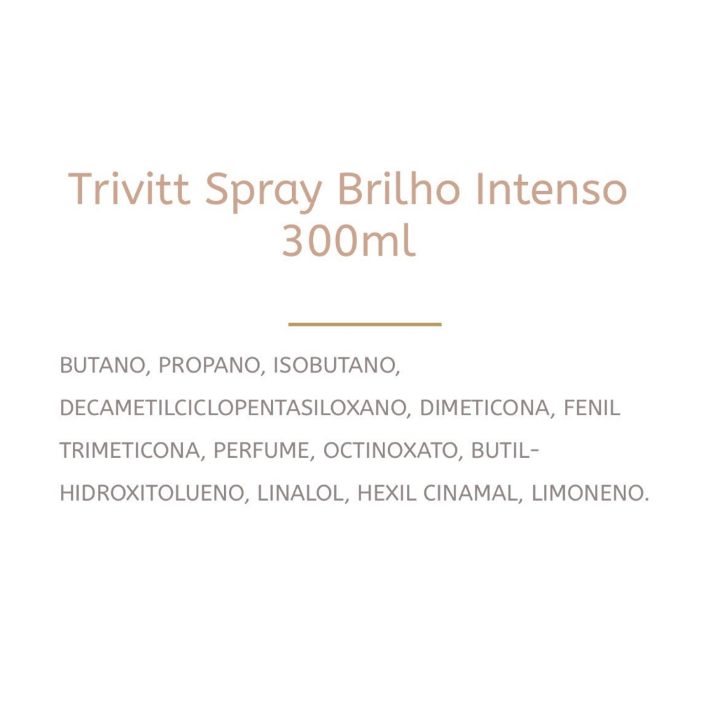 Trivitt Style Spray de Brilho Intenso dá luminosidade ao penteado enquanto protege o cabelo, realça e valoriza o penteado com brilho luminoso e deixa os fios macios e leves por não ser oleoso ao toque. Ativos: Blend de Silicones: Combinação de silicones multifuncionais e com grande afinidade pela fibra capilar. Proporciona aos cabelos maciez e sedosidade Promove brilho radiante Espalha-se facilmente sobre os fios Possui toque aveludado e não oleoso Filtro Solar: Absorve de forma eficiente a radiação UV-B. Protege os fios contra os danos provocados pela radiação UV-B É resistente à água Modo de Uso Na posição vertical e a uma distância aproximada de 20 cm, aplique sobre os cabelos secos distribuindo de maneira uniforme. Precauções INFLAMÁVEL. Não pulverizar perto do fogo. Conteúdo sob pressão. Não perfurar, nem incinerar. Não expor ao sol nem à temperaturas superiores a 50ºC. Guardar em ambiente fresco e ventilado. Proteger os olhos durante a aplicação. Evite a inalação deste produto. Uso externo. Mantenha fora do alcance de crianças. Prazo de Validade 36 meses
