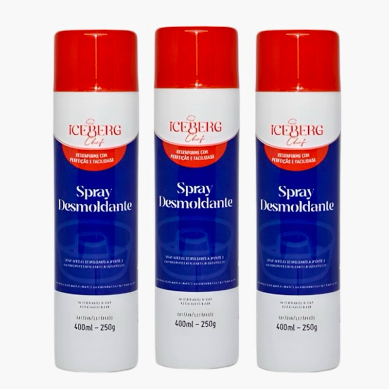 SPRAY DESMOLDANTE 400ml ICEBERG SOLTA FACIL 1~5 Un DESMOLDANTE SPREY ICEBERG 400ml Descrição do Produto: O Spray Desmoldante Iceberg Chef é uma solução prática e eficiente para untar formas, frigideiras e grill, evitando que massas, bolos, tortas e até carnes e vegetais grudem. Ideal para uso em confeitaria, o spray garante que suas preparações sejam desmoldadas com facilidade, sem a necessidade de farinha ou manteiga. Embalagem prática com 400ml, facilitando o uso no dia a dia na cozinha. Características do Produto: Marca: Iceberg Chef Tipo: Spray desmoldante alimentício Peso: 400ml Uso: Ideal para untar formas, frigideiras e grill, sem sabor residual Ingredientes: Óleos vegetais, ceras vegetais e lecitina de soja Outros: Não contém glúten. Contém derivados de soja