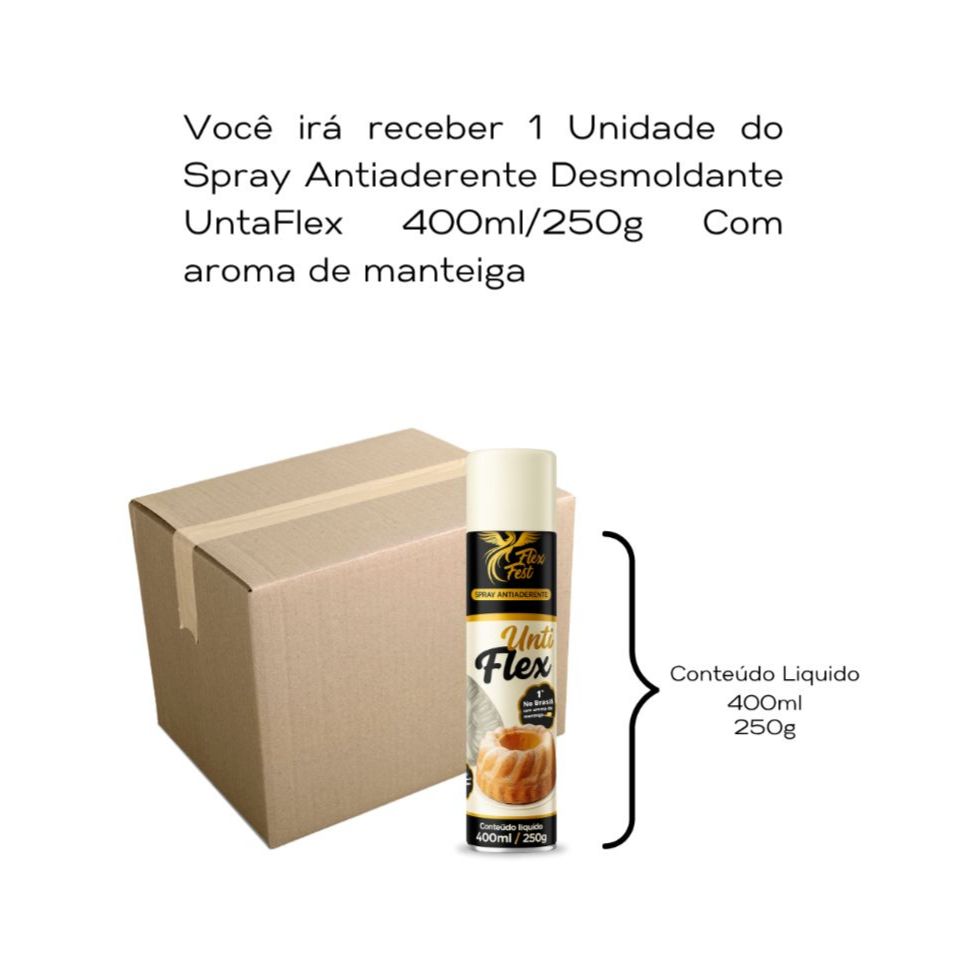 O Desmoldante Unta Flex é um spray desmoldante antiaderente untador inovador da marca Flex Fest, especialmente formulado para facilitar o preparo de receitas assadas, como bolos e tortas. Indicado para uso domético e profissional . Aroma manteiga • DIFERENCIAIS • Aroma Natural de Manteiga:Realça o sabor e o aroma dos preparos, deixando bolos, pães e doces com cheiro mais apetitoso. • Aplicação em Spray: Rápido, prático e uniforme – evita desperdício e facilita o uso em formas de qualquer formato. • Antiaderente Profissional:Garante que massas não grudem na forma, mesmo com receitas delicadas ou com alto teor de açúcar. • Ideal para Altas Temperaturas:Resiste ao calor intenso do forno sem queimar ou escurecer os preparos. • Não Altera o Sabor Original dos Alimentos • Isento de glúten, sem conservantes artificiais • BENEFÍCIOS PARA QUEM USA Agilidade no preparo – Ideal para produção em escala (padarias, docerias, buffets). Menos sujeira – Evita meleira de manteiga ou margarina. Mais rendimento – Um frasco de 400ml rende dezenas de aplicações. Redução de custos – Substitui o uso constante de papel manteiga, óleo ou margarina. • Principais Características: Marca: Flex Fest Nome do Produto: Unta Flex Tipo: Spray antiaderente culinário com aroma de manteiga Conteúdo: 400ml / 250g