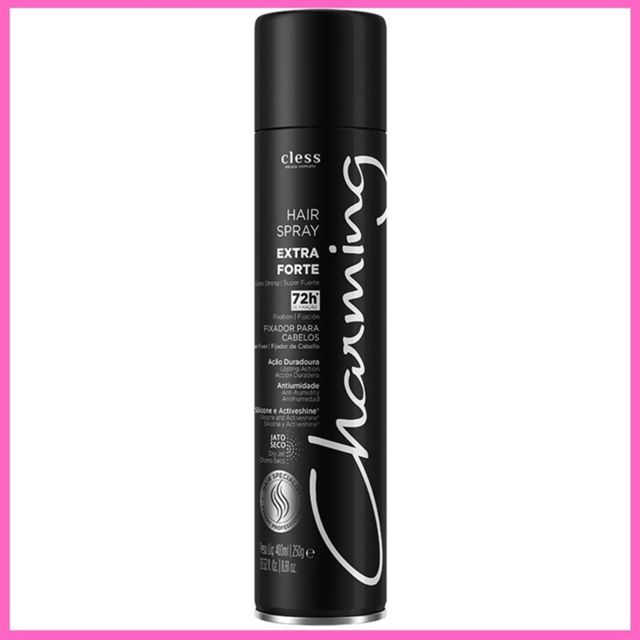 Spray Fixador Para Cabelo Charming Black Extra Forte Com 400ml O Spray Fixador Extra Forte Charming é ideal para finalização de penteados mais elaborados ou fixar cabelos mais volumosos ou difíceis de disciplinar.
