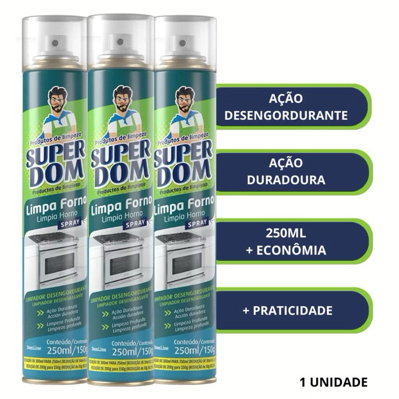 LIMPA FORNO SUPER DOM O Limpa Forno SuperDom foi elaborado com produtos de alta qualidade e desenvolvido especialmente para limpar a gordura incrustada, dissolvendo-a e dando brilho, sem a necessidade de raspagem. MODO DE USAR Agite bem a cada aplicação. O forno deve estar frio e desligado. Aplique o Limpa Forno DomLine na superfície desejada a uma distância de 20 cm. Deixe o produto agir por aproximadamente 20 minutos. Remova os resíduos com um pano levemente umedecido ou esponja. Caso necessário, repita a operação para obter melhor resultado. Deixe o forno aberto para ventilar antes de acendê-lo.
