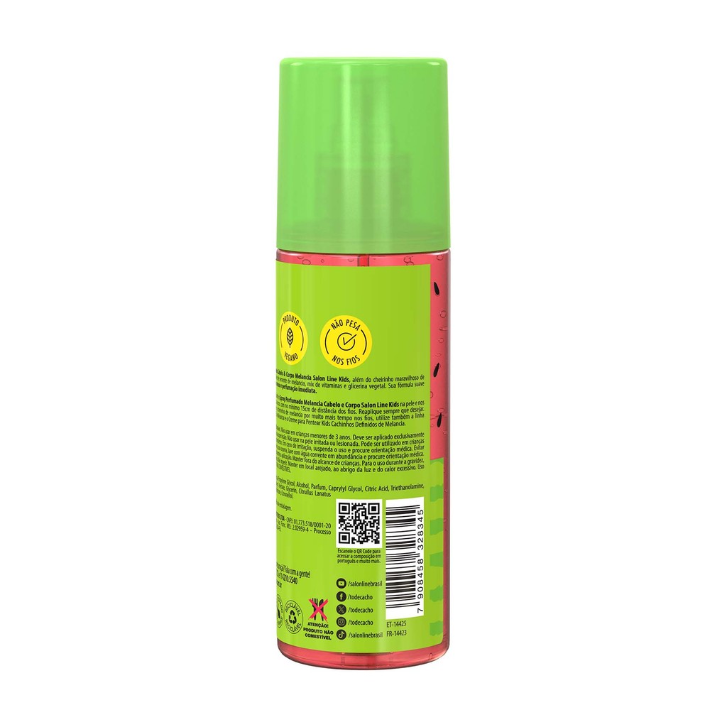 O Spray Perfumado Cabelo & Corpo Melancia Salon Line KIDS é uma deo colônia que proporciona uma perfumação imediata e incrível, prolongando o frescor e o cheirinho delicioso de melancia pelo corpo e no cabelo. É dermatologicamente testado. INDICAÇÕES Para quais tipos de cabelo? Todos. Qual a indicação? Sem Brilho. Pode usar a partir de quantos anos? A partir de 03 anos. ATIVOS Quais os principais ativos? O Spray Perfumado Cabelo & Corpo Melancia Salon Line KIDS, além do cheirinho maravilhoso de melancia, possui óleo de semente de melancia, mix de vitaminas e glicerina vegetal. Sua fórmula suave proporciona brilho aos cabelos sem pesar e perfumação imediata. MODO DE USO Qual a melhor forma de usar? Borrife o Spray Perfumado Melancia Cabelo & Corpo Salon Line Kids na pele e nos cabelos, úmidos ou secos, mantendo uma distância mínima de 15 cm. Reaplique sempre que desejar. DICA: Para intensificar o aroma de melancia por muito mais tempo nos cabelos, utilize também o Creme para Pentear Kids Cachinhos Definidos de Melancia . CARACTERÍSTICAS É produto vegano? O produto é Vegano.