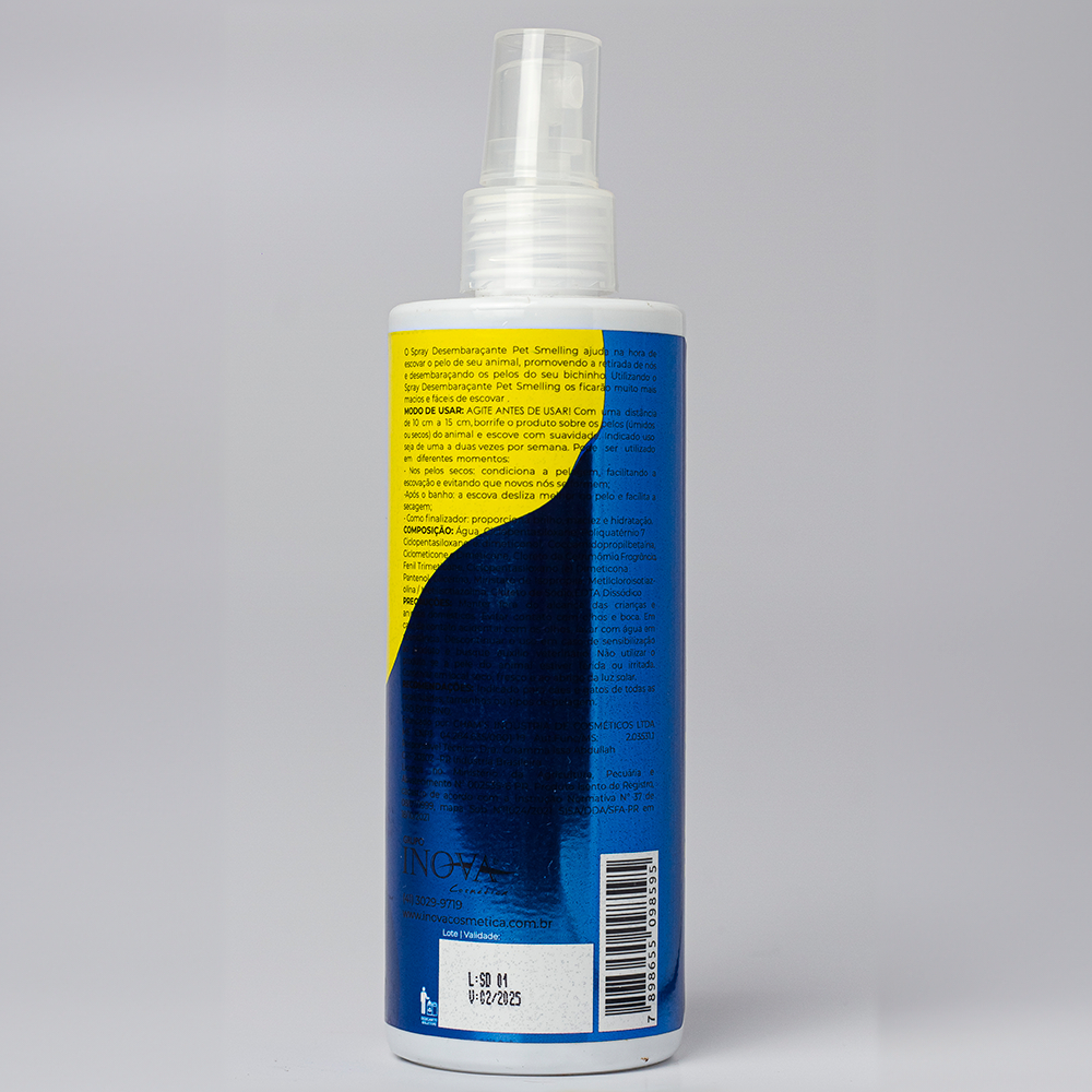 Apresentação: embalagem de 250 ml Uso veterinário Para Cães e Gatos Livre de Corantes, Parabenos e Petrolatos Amigo dos Animais Vegano Com Pantenol e Silicones Spray Desembaraçante Bifásico para pelos Curtos e Longos Pelos sem nós e mais cheirosos APRESENTAÇÃO: O Spray Desembaraçante Pet Smelling ajuda na hora de escovar o pelo de seu animal, promovendo a retirada de nós e desembaraçando os pelos do seu bichinho. Utilizando o Spray Desembaraçante Pet Smelling os pelos ficarão muito mais macios e fáceis de escovar.