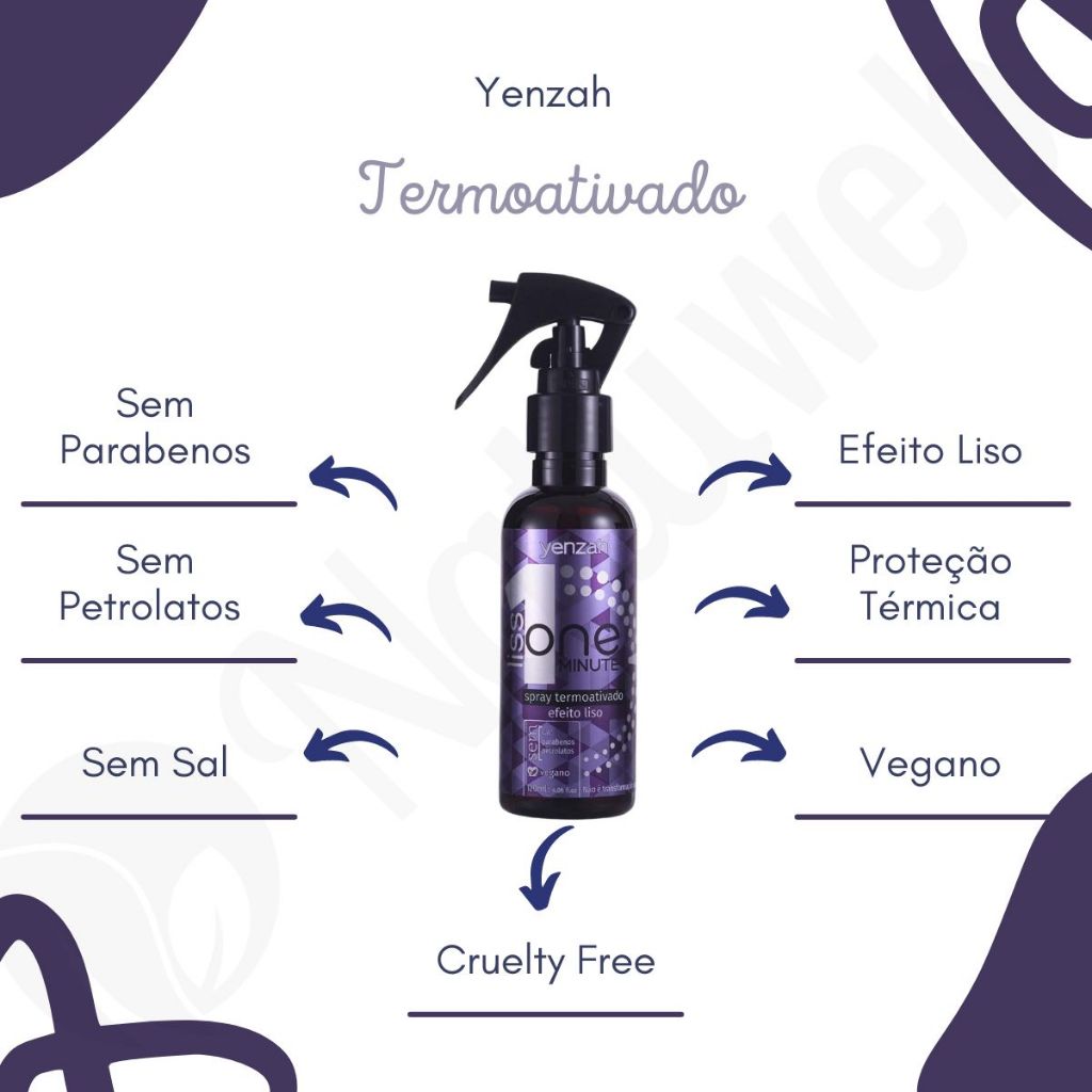 Spray Termoativado One Minute Liss Yenzah Efeito Liso 120ml O Spray Termoativado One Minute Liss é um fluído super levinho que proporciona o efeito liso perfeito: liso por mais tempo, proteção térmica, ação anti-frizz imediata, secagem rápida, escuro antiumidade, facilita a escovação, brilho intenso, balanço natural selagem das cutículas e proteção solar. Além disso, por não ser uma transformação, ele não altera a estrutura dos fios e não danifica, podendo ser utilizado várias vezes na semana. Com a aplicação mínima de 5 vezes, mesmo após a pausa no uso do produto, seu efeito pode durar até 2 semanas (em média 8 lavagens). Resultado: Cabelo mais liso, protegido, sem frizz, com brilho e balanço natural. Porque Usar One Minute Liss Yenzah: 1. Livre de Sal; 2. Livre de Parabenos; 3. Livre de Petrolatos; 4. Livre de Sulfatos; 6. Livre de Silicones; 7. Vegano; 8. Cruelty Free; 9. Combate a Queda. Modo de Uso: Com os cabelos úmidos, aplique o spray termoativado Yenzah One Minute Liss em todo cabelo. Seque com o uso de um secador e caso prefira, finalize com a prancha. Composição: Aqua, Dipropylene Glycol, Polysilicone-29, PPG-1 PEG-9 lauryl glycol ether, Parfum, Benzyl Benzoate, Benzyl Salicylate, Butylphenyl Methylpropional, Hexyl Cinnamal, Limonene, Linalool, Phenoxyethanol, Caprylyl Glycol, Propylene Glycol, Glycerin, Amaranthus Caudatus Seed Extract, Zea Mays Starch, Potassium Sorbate, Benzyl Alcohol, Sodium Benzoate, Gluconolactone, Phenethyl Alcohol, Calcium Gluconate, Tocopherol, Disodium edta, BHT, Citric acid. Código Anvisa 25351.614300/2018-59