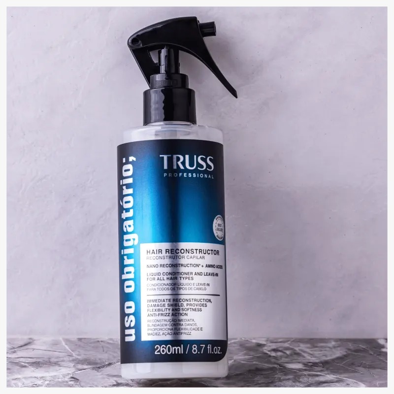Spray uso obrigatório; 260ml A nova versão o spray uso obrigatório; , um dos queridinhos da truss , está ainda mais irresistível, traz uma fragrância ainda mais sofisticada e duradoura mantendo o dna da linha uso obrigatório; e suas notas frutais, a fórmula evoluiu, incorporando tecnologia de ponta que é liberada perfume ao longo do dia através do contato com o oxigênio. A linha uso obrigatório; é o tratamento ideal para cabelos danificados e ressecados. Sua fórmula avançada promove reconstrução imediata, hidratação profunda e proteção contra os danos diários, reconstruindo a fibra capilar e até 87% menos quebra. Spray uso obrigatório; age como um tratamento instantâneo, desembaraçando, proporcionando força, condicionamento e maciez aos fios. Sua fórmula exclusiva, enriquecida com nano reconstruction e aminoácidos, condiciona e reconstrói os fios, promovendo ultra desembaraço. Restaura a força e resistência dos fios recuperando a flexibilidade e elasticidade adequadas. Para usar como máscara líquida ou finalizador, este spray é ideal para quem busca tratamento e praticidade sobretudo para cabelos danificados e fragilizados. Família olfativa: floral frutal