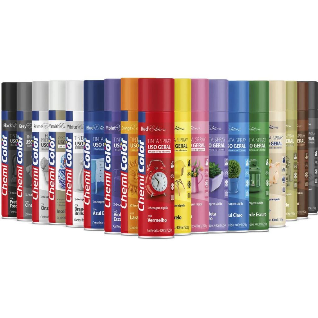 Características: - A linha Uso Geral Chemicolor Edition é elaborada com componentes de alta qualidade. - Indicada e aprovada para uso nos mais diversos tipos de pintura, tanto em ambiente externo como interno. - Respeitando o tratamento da superfície antes da aplicação, a linha pode ser utilizada em várias superfícies como metais, cerâmica, vime, gesso, etc. - A linha conta com o Fundo Uso Geral Chemicolor que é de alta aderência e pode ser usado em várias superfícies de metal. - A Tinta Spray Uso Geral Chemicolor que é indicada para diversos tipos de pintura, garantindo uma boa cobertura e acabamento, com alto rendimento e excelente secagem, com cores que proporcionam ótimo efeito decorativo. - E o Verniz Uso Geral Chemicolor que além do excelente acabamento e resistência, também deixa um acabamento brilhante. - Para todos esses resultados aplique seguindo as instruções abaixo.