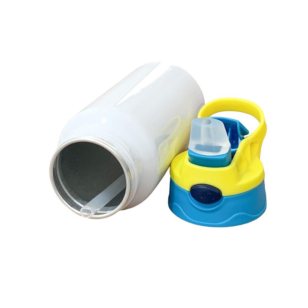 Squeeze de Alumínio Branco Infantil com Bico Automático, Tampa Azul e Alça Amarela para Sublimação - 500ml