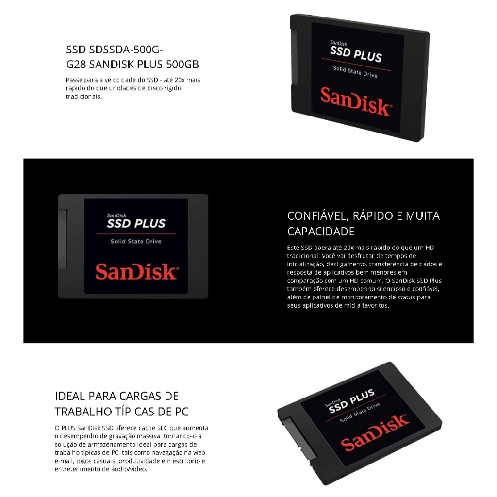SSD SanDisk Plus, 500GB, Sata III, Leitura: 545MBs e Gravação: 505MBs, SDSSDA-500G-G28 POR QUE ESTE SSD É IDEAL PARA O SEU SETUP? Este SSD oferece excelente desempenho para quem busca rapidez no carregamento do sistema, aplicativos e jogos. É uma solução confiável para substituir HDs tradicionais, proporcionando inicialização mais ágil e maior responsividade no dia a dia. - - - - - - - - - - - - - - - - - - - - - - - - - - - - - - - - - - - - - - - - BENEFÍCIOS REAIS PARA O CLIENTE • Velocidade de leitura de até 545MB/s para inicializações rápidas • Gravação de até 505MB/s para transferência eficiente de arquivos • Aumento significativo na performance do PC ou notebook • Maior durabilidade e resistência em comparação a HDs tradicionais • Ideal para sistemas operacionais, trabalho e games leves - - - - - - - - - - - - - - - - - - - - - - - - - - - - - - - - - - - - - - - - INFORMAÇÕES ESSENCIAIS • Marca: SanDisk • Modelo: SDSSDA-500G-G28 • Cor: Preto • Dimensões: 69,85 x 100,5 x 7,1 mm - - - - - - - - - - - - - - - - - - - - - - - - - - - - - - - - - - - - - - - - ESPECIFICAÇÕES TÉCNICAS • Marca: SanDisk • Modelo: SDSSDA-500G-G28 • Capacidade: 500GB • Leitura: Até 545MB/s • Gravação: Até 505 MB/s • Dimensõe: 69,85 x 100,5 x 7,1 mm • Interface: SATA Revisão 3.0 (6 Gb/s) • Temperatura operacional: 32 ºF a 158 ºF (0 ºC a 70 ºC • Vibração: gRMS, 10-2000 HZ / 4,9 gRMS, 7-800 HZ - - - - - - - - - - - - - - - - - - - - - - - - - - - - - - - - - - - - - - - - TERABYTE SHOP OFICIAL: 19 ANOS DE LEGADO TECH A loja preferida de Gamers e Entusiastas é referência em qualidade e excelência. Montamos seu setup dos sonhos com produtos de alta performance e suporte excepcional. Sua melhor experiência em tecnologia começa aqui!