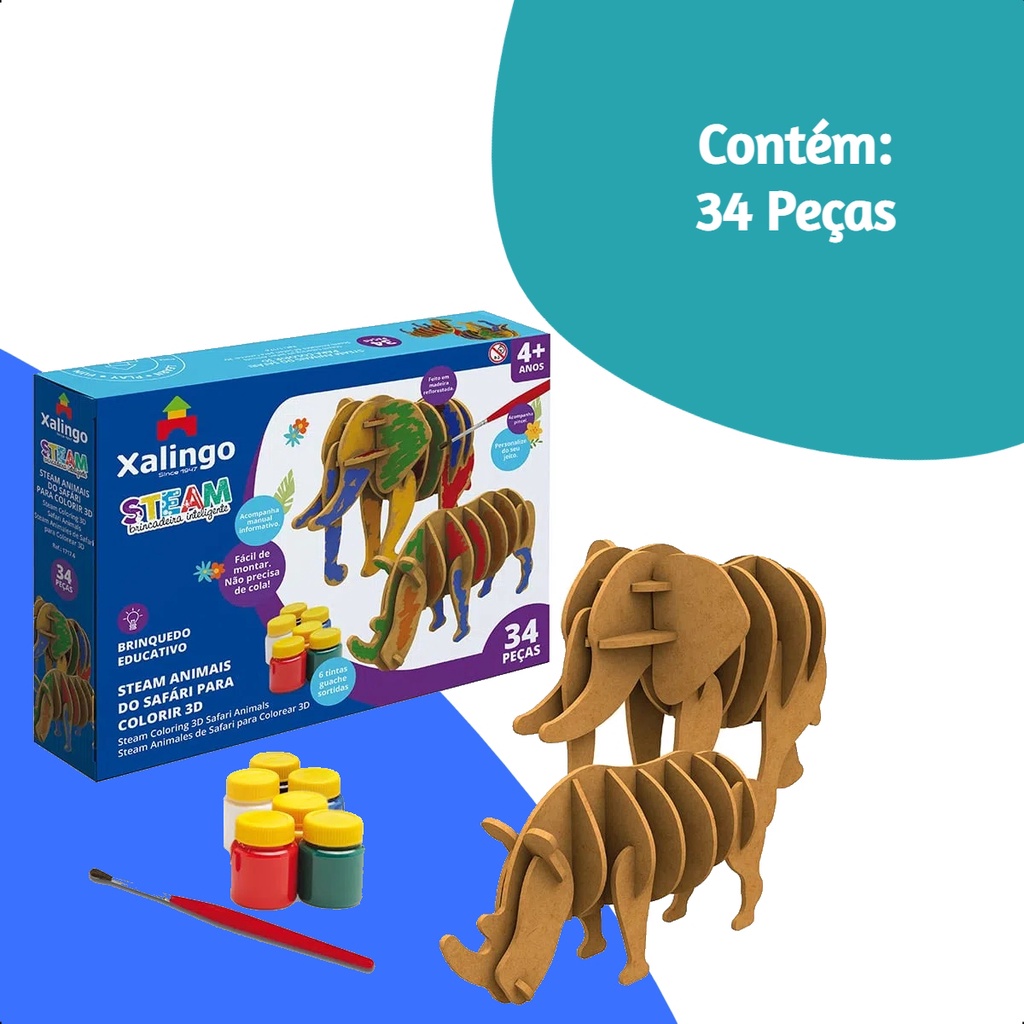 O quebra-cabeça 3D Animais do Safari, da linha STEAM da Xalingo Brinquedos, possibilita a montagem de dois animais (rinoceronte e elefante) através do encaixe de suas peças. Desenvolve a imaginação e o pensamento lógico ao comparar e associar peças. Depois de montados, você pode personalizar ao colorir e decorar com as tintas que acompanham o brinquedo, no estilo Faça Você Mesmo. Acompanha 34 peças e é Indicado para crianças a partir de 4 anos. É pura diversão! Validade da tinta: 6 meses após aberto. Composição da tinta: Base, Pigmento, Água e conservante. Caso em contato com olhos, lave bem com água; se ingerido, não provoque vômito, beba bastante água e consulte um médico. Assim como outras tintas pode manchar tecidos. Características: - Marca: Xalingo - Modelo: Steam Quebra-cabeça 3D Animais do Safari para Colorir (17176) *Imagens Meramente Ilustrativas Especificações Técnicas: - Inmetro: 005880/2020 - Idade Recomendada: A partir de 4 anos - Contém 34 peças - Material: Madeira Reflorestada Conteúdo da Embalagem: - 1x Steam Quebra-cabeça 3D Animais do Safari para Colorir