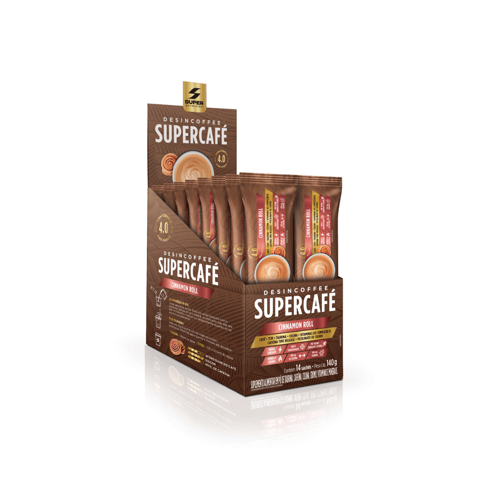 Desincoffee Supercafé Cinnamon Roll - 14 sticksMAIS SABOR E MELHOR PERFORMANCECAFÉ • TCM • TAURINA • SEM AÇÚCAR • ADOÇADO COM STÉVIA CAFEÍNA TIME RELEASE • COLINA • MINERAIS • PICOLINATO DE CROMO • VITAMINAS DO COMPLEXO B O Desincoffee Supercafé te proporciona energia, foco e concentração. Com muito, muito sabor, serve para você encarar seus desafios diários, sejam eles de exigência física ou mental. Entre seus ingredientes estão 100mg de cafeína por porção, que auxilia no aumento do estado de alerta e na melhora da concentração. É um combustível para que suas atividades terminem, mas sua energia não. CONFIRA PARA QUEM SERVE O SUPERCAFÉ:DESEMPENHOPARA ATLETASFOCO NOTRABALHOQUEM BUSCA OMELHOR PRÉ TREINOCONCENTRAÇÃOPARA ESTUDANTESPESSOASMULTITAREFASMODO DE PREPARO:Dissolva 1 scoop (10g) em água quente (100 a 200 mL);Misture bem e está pronto para consumir! RECOMENDAÇÃO DE USO: Consumir 1 dose ao dia ou conforme orientação do médico ou nutricionista. PERGUNTAS FREQUENTES Quando devo consumir o produto? Consumir até 2 vezes ao dia, ou conforme orientação profissional. O produto quebra jejum?Sim, embora o produto seja baixo em calorias, há um aporte nutricional que interfere no jejum. Contudo, é uma forma interessante de quebrar jejum devido aos benefícios de seus ingredientes, sem intervir em pico insulínico. Quais as contra indicações? Produto contra indicado para gestantes, lactantes e crianças. Pode ser consumido com café? Recomendamos o consumo apenas de acordo com o modo de preparo, para garantir o sabor e funcionalidade desejada. Posso misturar com leite? Recomendamos consumi-lo apenas com a diluição em água. Posso consumir todos os dias? Ou devo realizar pausas?O produto é um suplemento alimentar e não tem nenhuma relação com medicamentos, não é necessário realizar pausas no consumo, podendo ser de uso diário e contínuo para manutenção da saúde. Tenho sensibilidade com pré-treinos comuns. Posso usar mesmo assim?Recomendamos que converse com seu médico ou nutricionista. Possuo histórico de problemas cardíacos e/ou coronários. Devo tomar?Neste caso, devido as propriedades estimulantes do produto não recomendamos o uso. Pode ser usado como pré-treino?Sim, por conter suplementos voltados para aumento de resistência física, energia e foco, pode ser usado como pré-treino. Recomendamos no mínimo 30 minutos antes da atividade física. Posso preparar gelado?Sim, o produto solubiliza e mantém um ótimo sabor mesmo em água fria. O produto é vegano? É sem lactose?Não. Alguns ingredientes podem conter traços de leite. Tem diferença entre o DESINCOFFEE para o SUPERCAFÉ?Sim, o Supercafé traz a proposta de unir a funcionalidade do Desincoffee aliada a explosão de sabor.