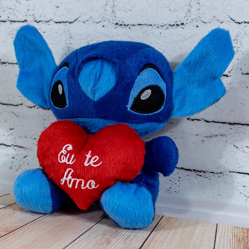 Stitch segurando um coração escrito Eu te amo de Pelúcia