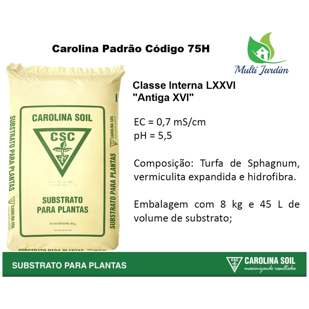 Formulação 75H "antigo XVI" Saca 8 -9 kg 45 Litros IMPORTANTE: - Compra limitada até 2 unidades. A Carolina Soil do Brasil produz substratos para plantas com tecnologia industrial de ponta e rigoroso controle de qualidade com o objetivo de atender as necessidades mais específicas de seus clientes, auxiliando-os para alcançarem o máximo rendimento do potencial de cada planta. Ideais para produção de mudas de tabaco, reflorestamento, nativas, frutíferas, ornamentais, café, cacau e hortaliças em geral. Característica Resultado Substrato pronto para utilização Não necessita realizar pré-misturas. Matéria-prima controlada e livre de contaminantes Produto totalmente estável e homogêneo Produto de baixa densidade Mais espaço e aeração, aumentando assim o sistema radicular das suas culturas Produto leve e com grande rendimento Facilidade no manejo e no saque da mudas, tanto no tubete quanto na bandeja Comercializado em palete com proteção a fatores climáticos Agilidade na descarga, e possibilidade de armazenagem em local descoberto