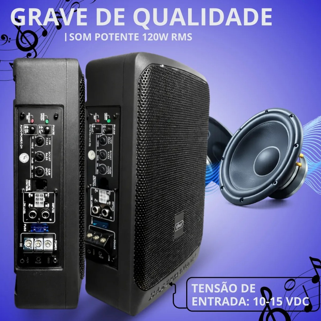 Transforme a experiência sonora do seu carro com o Subwoofer Ativo Automotivo Knup KP-SC508, desenvolvido para quem busca graves mais profundos, definidos e de alta qualidade, sem perder espaço interno. Com 120W RMS de potência real e amplificador digital integrado, este subwoofer oferece excelente desempenho sonoro sem a necessidade de módulos externos. Seu design slim ultracompacto permite instalação discreta embaixo do banco do veículo, mantendo o porta-malas livre e o interior organizado. Compatível com entradas RCA, o KP-SC508 pode ser facilmente conectado a centrais multimídia ou ao som original do veículo, proporcionando uma melhoria imediata na performance do áudio, com graves encorpados e resposta precisa. PRINCIPAIS BENEFÍCIOS . Graves mais profundos, firmes e bem definidos . Amplificador digital integrado, dispensando módulo externo . Instalação simples e prática com entrada RCA . Design slim ideal para espaços reduzidos . Melhora significativa no som sem ocupar o porta-malas ESPECIFICAÇÕES TÉCNICAS Potência nominal: 120 W RMS Tamanho do alto-falante: 6 x 9 polegadas Resposta de frequência: 20 Hz a 150 Hz Sensibilidade: 91 dB Relação sinal-ruído: superior a 91 dB Entrada de sinal: RCA Tensão de funcionamento: 10 a 15 V DC Impedância: 4 ohms Ajuste de graves: 45 Hz com variação de 0 a 12 dB Sistema de proteção contra sobretemperatura, curto-circuito e sobrecarga. CONTEÚDO DA EMBALAGEM 01 Subwoofer Ativo Automotivo Knup KP-SC508 01 Manual de instruções Produto novo, original e de alta qualidade, com a confiabilidade da marca Knup.