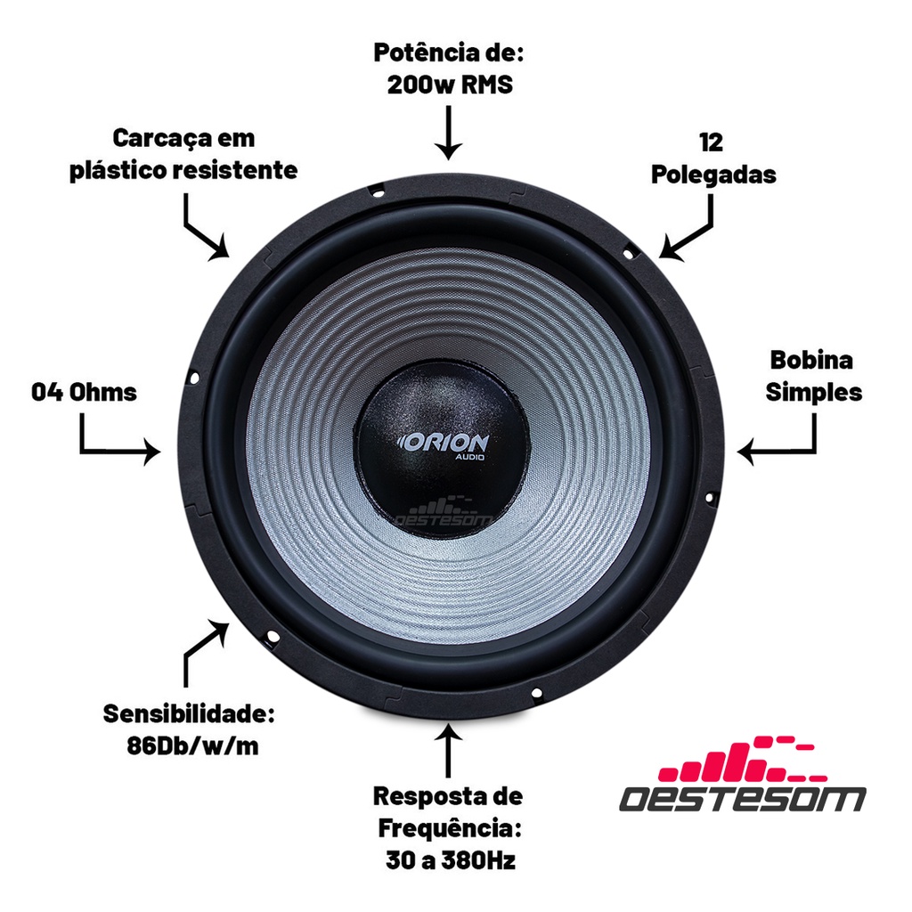 SUBWOOFER 12' 200W Utilizados para sistema de som interno, os subwoofers reproduzem sub graves com muita qualidade (Pancadões). Com 12 polegadas de diâmetro, 200W RMS de potência em 4 Ohms, bobina simples, ótima resposta de frequência e sensibilidade, uma ótima opção para a instalação do som do seu carro. Especificações técnicas: 12 polegadas 200W RMS 4 Ohms Bobina Simples Resposta de frequência 30 a 380Hz Sensibilidade 86dB/w/m Carcaça em plástico resistente FABRICANTE: ORION AUDIO Conteúdo da embalagem: 1 SubWoofer.