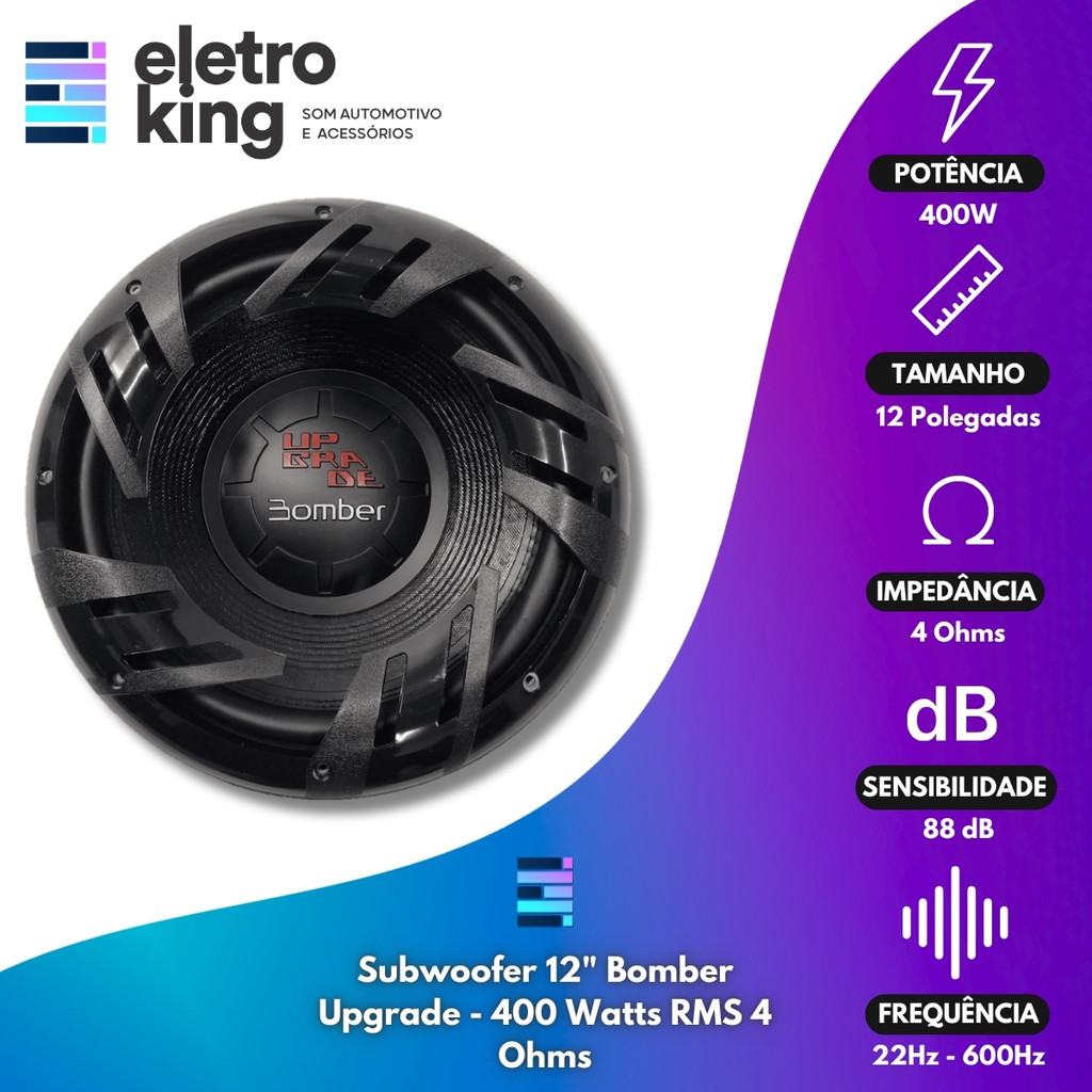 Seja bem-vindo a Eletroking, leia atentamente a descrição do produto abaixo antes da compra, qualquer dúvida, nos acione no campo de perguntas do anúncio. Subwoofer 12 Bomber Upgrade - 400 Watts RMS 4 Ohms Subwoofer 12 Bomber Upgrade - 400 Watts RMS 4 Ohms: um modelo de alta potência e graves profundos para quem busca qualidade sonora superior. Com 400W RMS e impedância de 4 Ohms, ele oferece resposta de frequência de 22 Hz a 600 Hz, proporcionando graves marcantes e suaves. Equipado com cone de celulose prensada e resina, garante durabilidade e resistência. Sua sensibilidade de 88 dB, bobina de alumínio de 46,3 mm e suspensão de borracha entregam um desempenho robusto e profissional. Modelo SW12UP400-4, compacto e poderoso, perfeito para som de alto impacto. Especificações Técnicas: • Potência de programa musical: 400 WATTS RMS • Impedância nominal: 4 Ohms • Resposta em frequência (–10 dB): 22 Hz - 600 Hz • Resposta em frequência (–3 dB): 33 Hz - 290 Hz • Sensibilidade (Banda efetiva): 88 dB SPL • Diâmetro da bobina: 46,3 mm • Material do corpo da bobina: Alumínio • Material do fio da bobina: Cobre • Tamanho: 12 • Material do cone: Celulose • Material suspenção: Borracha • Material da centragem: Algodão + poliéster • Material da carcaça: Aço • Peso líquido: 4 kg • Dimensões do produto (L x A x P): 331 x 142 x 331 mm Conteúdo da Embalagem: • 01 Alto-Falante Subwoofer Upgrade 12 400W RMS 4 Ohms • Manual e Certificado de Garantia Importante: • Garantia de 273 Dias. • Valor do Kit • Todos os Nossos Produtos São Novos, Originais e Acompanham Nota Fiscal. • A Eletroking recomenda que a instalação seja feita por profissional especializado e não se responsabiliza pelo mau uso do produto.
