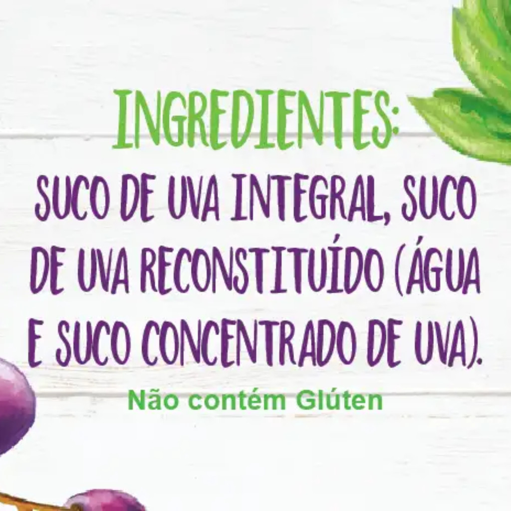 INFORMAÇÕES DE DESTAQUE • Sem glúten • Sem conservantes • Sem adição de açúcares • 100% Suco de Uva DESCRIÇÃO O Suco de Uva Integral é uma escolha natural e saudável para complementar sua dieta. Elaborado com suco de uva integral e reconstituído, é isento de conservantes e açúcares adicionados, oferecendo uma experiência autêntica de sabor e qualidade. Suas embalagens são BPA FREE, garantindo segurança para o consumo diário. INGREDIENTES Suco de uva integral, suco de uva reconstituído (água e suco concentrado de uva). NÃO CONTÉM GLÚTEN. DICAS DE CONSUMO O suco de uva pode ser consumido a qualquer hora do dia, seja no café da manhã, nos lanches intermediários ou como uma alternativa prática para complementar a hidratação. Pode ser utilizado como fonte de energia antes ou durante atividades físicas de longa duração e para reposição energética após o treino.