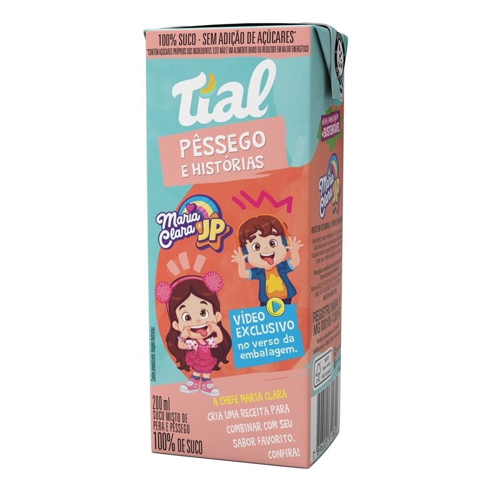 Características do Produto: Marca: Tial Peso: 200ml Sabor: Laranja e Pera Tema do Produto: Maria Clara & JP Características Adicionais: Linha do Produto: Histórias Com potencial hidrogeniônico (PH) é de 3,0-4,1 100% de suco, sem adição de açúcar Com vídeo exclusivo no verso da embalagem Ingredientes: Suco de pera reconstituído (64,8%), suco de pêssego reconstituído (35,2%), vitamina C, acidulante ácido cítrico e aromatizantes. Recomendações e Orientações: Sempre observar as informações contidas no rótulo. Agite antes de beber. Pronto para beber. Fornecedor: Tropical Industria de Alimentos SA