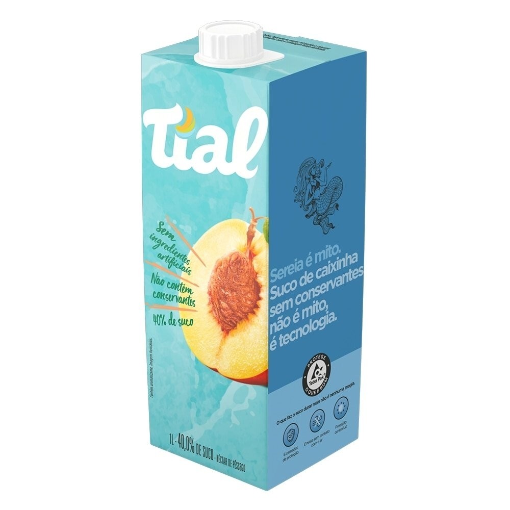 Características Principais do Produto: Marca: Tial Tamanho: 1 Litro Sabor: Pêssego Conservação: Temperatura ambiente Ingredientes: Água Suco concentrado de pêssego Açúcar Acidulante ácido cítrico Aroma natural de pêssego Vitamina C Informações Nutricionais: Valor energético: 72Kcal/306kJ Carboidratos: 18g Açúcares: 18g Proteínas: 0g Gorduras totais: 0g Gorduras saturadas: 0g Gorduras trans: 0g Fibra alimentar: 0g Sódio: 7mg Vitamina C: 30mg Dimensões do Produto: Altura: 21.2 cm Largura: 7.5 cm Comprimento/Profundidade: 7.5 cm Fornecedor: Tropical Industria de Alimentos