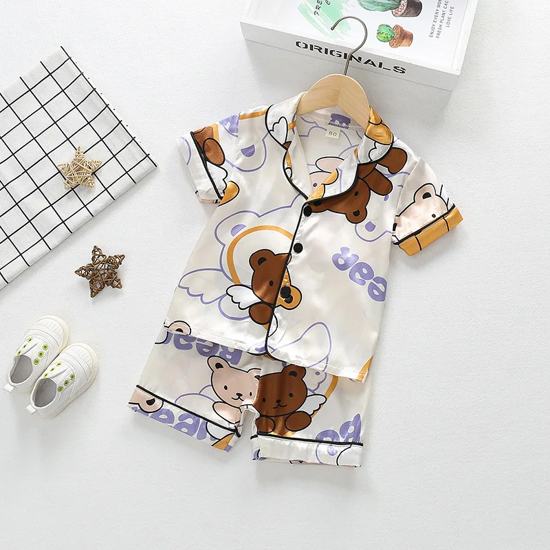 Summer Baby Boys Meninas Pijamas De Seda Conjunto Pijama Para Crianças Satin Cartoon Manga Curta + Shorts Roupa De Noite