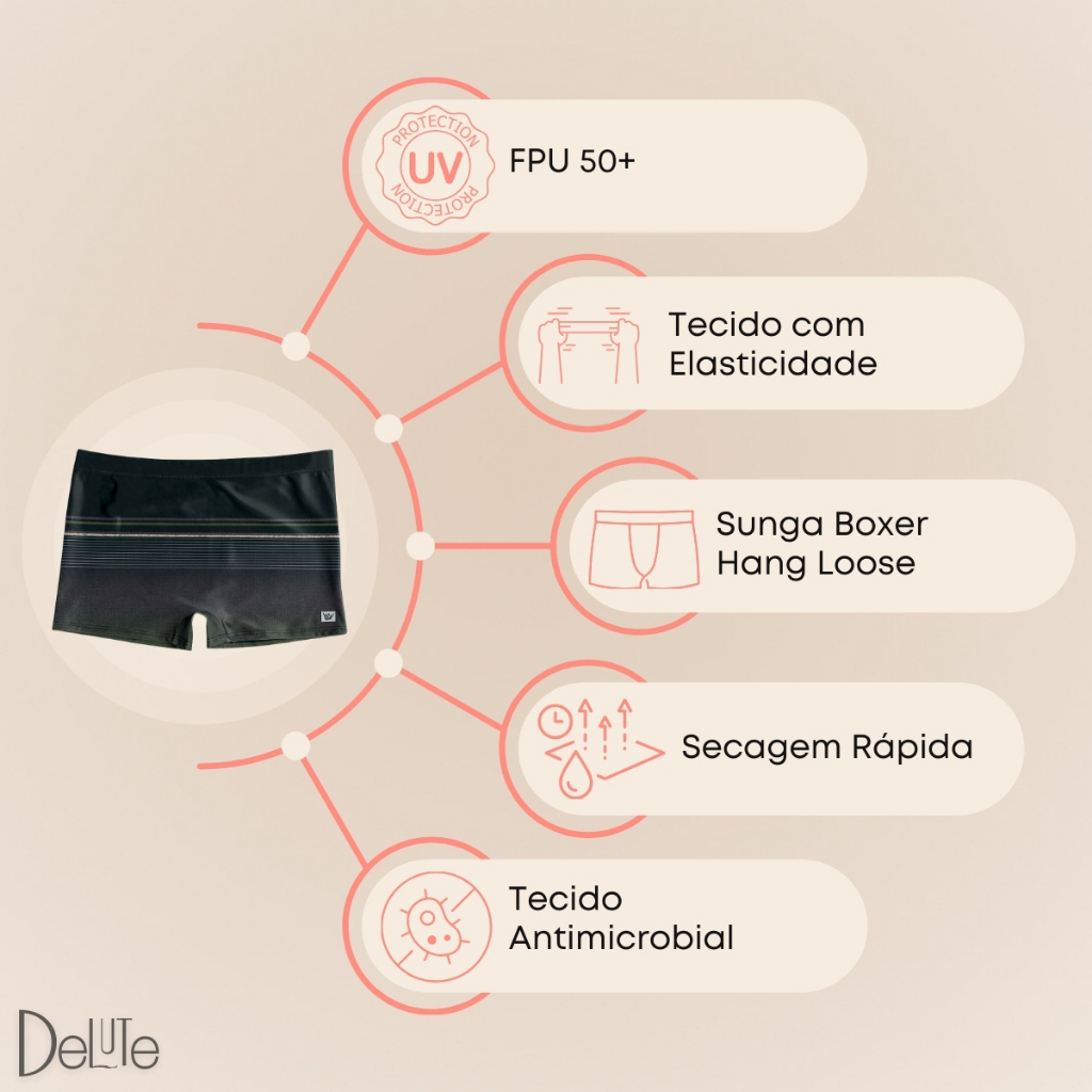 Sunga Boxer Estampada Hang Loose Ref: HL394 Com estilo clássico e discreto para todos os gostos, a sunga lisa é feita em poliéster e elastano, tendo uma ótima durabilidade e ajuste perfeito ao corpo. Confeccionado em poliamida, este modelo de sunga garante maior conforto e liberdade de movimentos. Possui cordão no cós para ajuste. Ideal para homens que buscam conforto e segurança para a prática de esportes aquáticos, resiste até 10 vezes mais cloro em relação a produtos sem esse tratamento, permitindo maior conforto, durabilidade e ótimo ajuste ao corpo. - Ideal para curtir os dias de verão. - Conforto e mobilidade dentro d'água. - Possui cordão interno para regulagem. - Super confortável. Composição: Tecido: Poliéster 85% Elastano 15% Forro: Poliamida 100%