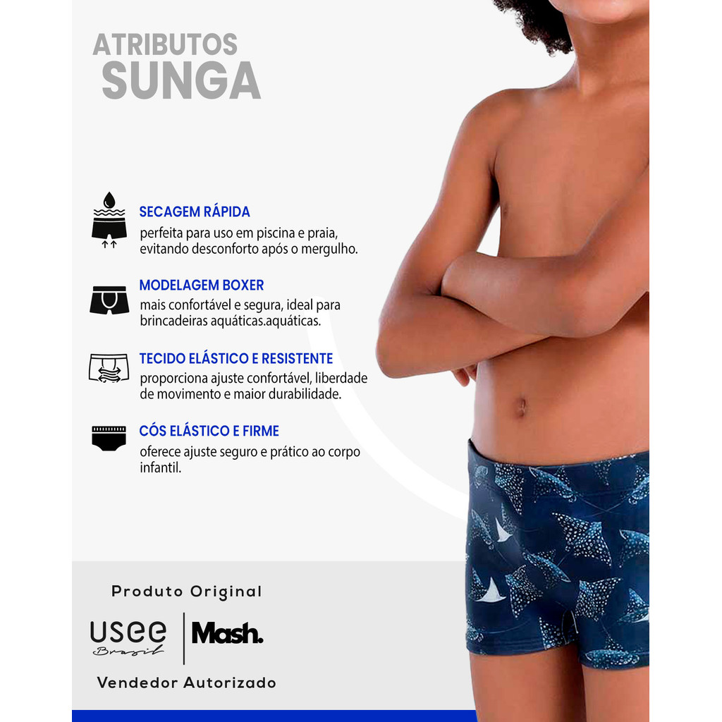 Sunga Boxer Infantil Estampada Coordenada Oceano Mash Modelo: 310.89 Descrição do Produto: Conforto, estilo e diversão para os pequenos curtirem o verão com segurança. A Sunga Boxer Infantil Mash traz o equilíbrio ideal entre design moderno, praticidade e resistência, com uma estampa temática inspirada no oceano, que deixa o visual divertido e cheio de personalidade. Desenvolvida em tecido de alta qualidade, oferece ajuste firme, liberdade de movimentos e secagem rápida, garantindo conforto tanto na piscina quanto na praia. Principais Benefícios: - Tecido elástico e resistente: Proporciona liberdade de movimentos e alta durabilidade. - Estampa coordenada oceano: Visual divertido e moderno para deixar os pequenos ainda mais estilosos. - Modelagem boxer: Mais confortável e segura, ideal para brincadeiras aquáticas. - Secagem rápida: Perfeita para uso em piscina e praia, evitando desconforto após o mergulho. - Cós elástico firme: Oferece ajuste seguro e prático ao corpo infantil. Especificações Técnicas: - Marca: Mash. - Modelo: 310.89. - Tipo: Sunga Boxer Infantil. - Estampa: Coordenada Oceano. - Gênero: Meninos. - Composição: Poliéster e elastano. - Cós: Elástico macio e confortável. - Indicado para: Praia, piscina e lazer. Cuidados com a Peça: - Lavar à mão com sabão neutro. - Não usar alvejante. - Secar à sombra. - Não passar ferro. - Evitar contato com superfícies ásperas para preservar o tecido. A Sunga Boxer Infantil Estampada Coordenada Oceano Mash pode ser encontrada aqui na Usee Brasil! Sobre a Usee Brasil: A Usee Brasil é uma empresa brasileira que oferece uma variedade de produtos de alta qualidade, desde roupas e acessórios até itens para casa. Tenha uma experiência conosco!