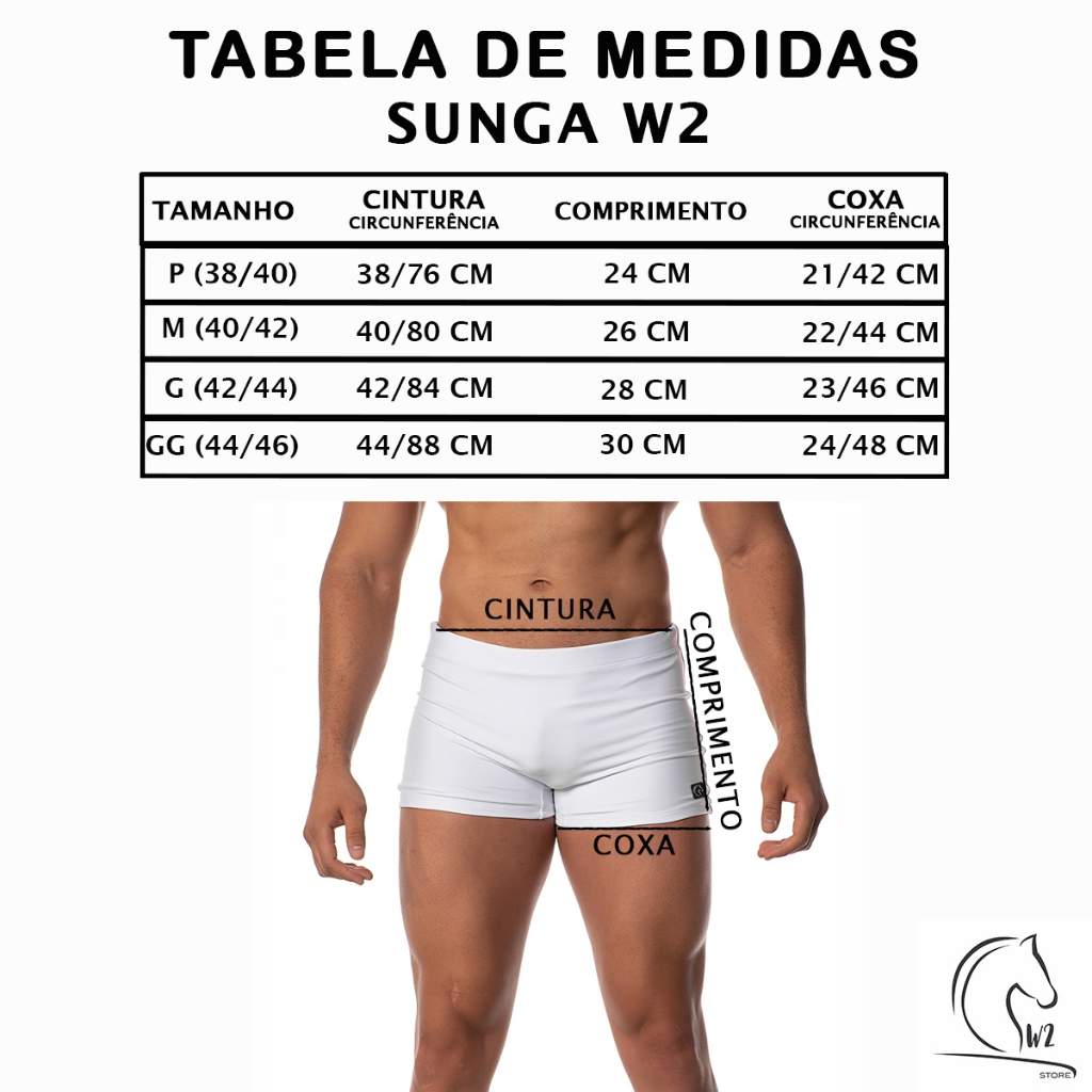 SUNGA W2 **PRODUTOS DE FABRICAÇÃO PRÓPRIA E DE EXCELENTE QUALIDADE!** Modelagens exclusivas W2 (caimento perfeito no corpo), costuras reforçadas (garantia de resistência) e tecidos de categoria premium que não deformam (garantia de qualidade, durabilidade e conforto). DESCRIÇÃO: A SUNGA W2 oferece um bom caimento proporcionando um designer exclusivo e moderno. A qualidade do produto começa a partir da materia prima escolhida por profissionais com anos de experiência na industria da moda! Utilizamos malha premium e linhas de costuras especiais que garantem uma costura reforçada e de ótima durabilidade. Características Diferenciadas (Benefícios): - Marca: W2 Store - Tecido de malha suplex premium 92% poliéster + 8% elastano - Fabricação própria. - Costura reforçada com linhas especiais para uma ótima durabilidade do produto. - Cordão com saída interna caseada para auxiliar no ajuste ao corpo. - Ótimo caimento e toque macio - Produto super durável (oferece mais resistência e durabilidade, não desfiando e nem rasgando com facilidade) - Qualidade superior, não deforma e não desbota. TABELA DE MEDIDAS: - P: CINTURA/CIRCUNFERÊNCIA 38/76 COMPRIMENTO 24 COXA/CIRCUNFERÊNCIA 21/42 - M: CINTURA/CIRCUNFERÊNCIA 40/80 COMPRIMENTO 26 COXA/CIRCUNFERÊNCIA 22/44 - G: CINTURA/CIRCUNFERÊNCIA 42/84 COMPRIMENTO 28 COXA/CIRCUNFERÊNCIA 23/46 - GG: CINTURA/CIRCUNFERÊNCIA 44/88 COMPRIMENTO 30 COXA/CIRCUNFERÊNCIA 24/48 ATENÇÃO **As medidas podem variar até 2 cm para mais ou para menos** Para conservar sua roupa nova e bonita por muito mais tempo é fundamental seguir algumas recomendações: - Lavar a mão; - Não utilizar alvejantes; - Secar a sombra; - Não utilizar ferro sobre a borrachinha SOBRE A MARCA A W2 STORE foi criada com o propósito de oferecer produtos de personalidade e qualidade superior. Acreditamos muito nisso! Surgimos em Franca-SP, a partir do sonho de nossos idealizadores em empreender nesse setor e inspirados principalmente pela coragem e persistência de um de nossos fundadores. Somos fabricantes de todos os nossos produtos e nosso design é exclusivo! Com isso, você obtém produtos diferenciados sobretudo daqueles produzidos em grandes varejistas. DÚVIDAS FREQUENTES: 1- O PRODUTO É NOVO? Resposta: Sim. Todos os nossos produtos são novos! 2- QUAL A COMPOSIÇÃO E QUALIDADE ? Utilizamos tecido de malha suplex premium de poliéster com elastano que confere qualidade superior aos nossos produtos. 3- QUAL O TAMANHO DAS SUNGAS ? Nossa modelagem é exclusiva e atualmente trabalhamos do P ao GG TABELA DE MEDIDAS LOGO ABAIXO OU JUNTO AS FOTOS DO ANÚNCIO Obs: Em breve pretendemos incluir em nosso catálogo produtos nos tamanhos especiais! 4- O TECIDO É RESISTENTE ? Resposta: Sim, nossas peças são fabricadas com tecido premium resistente e costuras reforçadas! Resistentes para uso esportivo e para os dias de lazer! 5- É RECOMENDAVEL PEGAR UM TAMANHO MAIOR OU MENOR? Resposta: Depende! Recomendamos que a escolha seja pelo tamanho utilizado normalmente, mas fique à vontade para consultar nossa tabela de medidas para realizar a melhor escolha. Lembrando que os nossos modelos possuem um corte moderno que se ajusta melhor ao corpo. Restou alguma dúvida ? Nós estamos ansiosos para te atender.