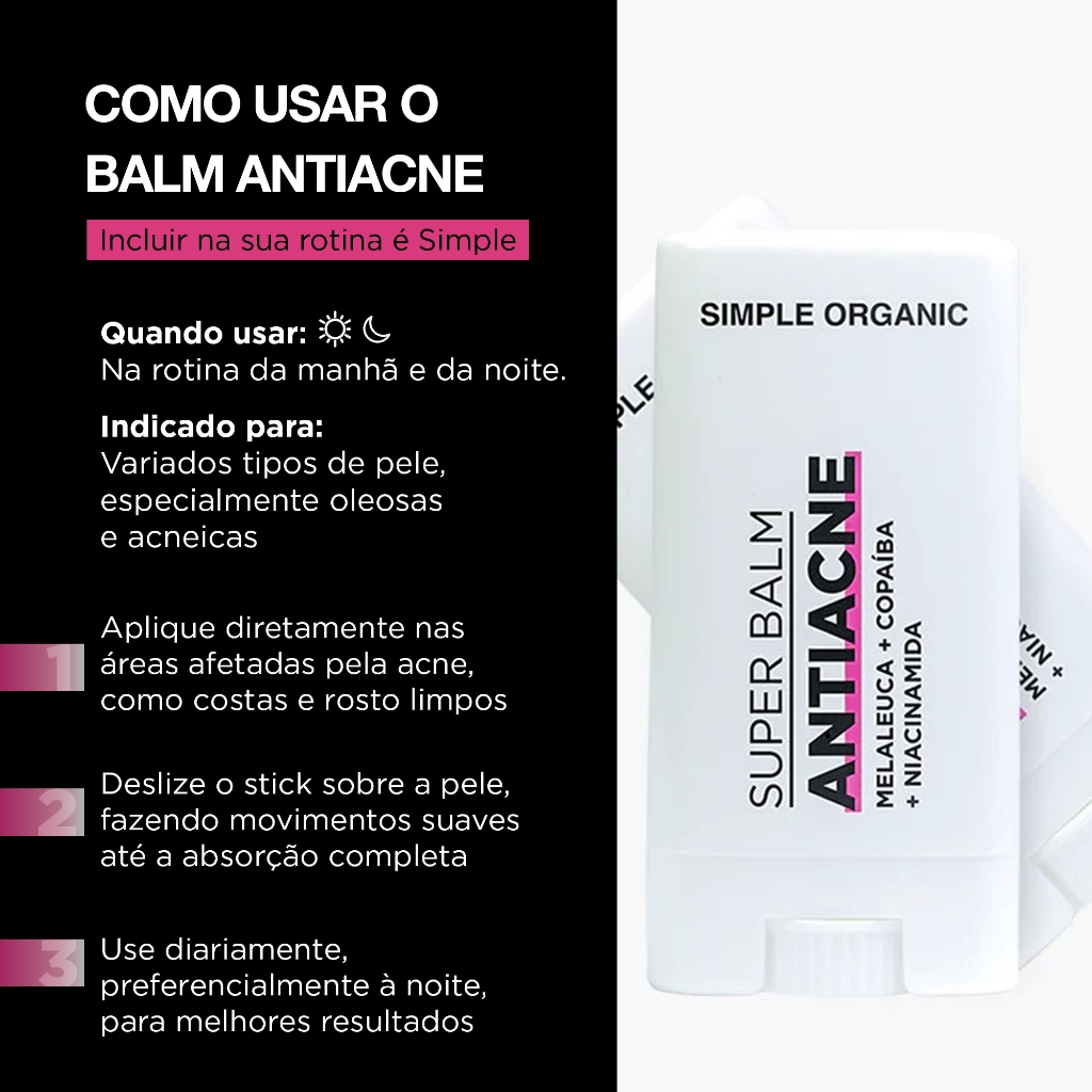 Se sua pele é oleosa e com tendência a acne, o Super Balm Antiacne é a perfeição em formato de stick. Formulado com um mix de ativos naturais e sustentáveis poderosos, é o produto que vai transformar sua rotina de cuidados com a pele oleosa e acneica. Entre eles estão o Óleo de Copaíba, que reduz a acne, controla a oleosidade, age nas espinhas mais inflamadas ao mesmo tempo em que hidrata, reduz a aparência de manchas e previne seu surgimento. Já a Niacinamida, queridinha da nossa comunidade e presente em nossos best-sellers, potencializa a hidratação e a oleosidade, além de fortalecer a barreira da pele e repara os danos causados pela exposição aos raios UV, além de uniformizar o tom, atenuar os poros e minimizar a sensibilidade. A Melaleuca atenua a vermelhidão e tem atividade secativa. Super versátil, o Super Balm Antiacne é livre de ingredientes sintéticos e problemáticos comuns aos sticks da beleza convencional, como Silicones, Ceras, Conservantes e fragrâncias sintéticas ou de origem animal, Petrolato, Parafinas e EDTA. Para substituí-los e seguir os nossos valores de Clean Beauty, optamos por Ceras naturais de Girassol e Arroz, emolientes e agentes de textura naturais certificados,Conservante derivado do Óleo de Côco certificado e vitamina E de origem natural certificada. É o melhor para sua pele oleosa e acneica e, claro, para o planeta. Responsabilidade socioambiental Nosso Óleo de Copaíba é obtido do tronco da árvore Copaifera officinalis, uma planta nativa da região Amazônica. Sua extração é consciente, sustentável e não agressiva, que mantém a planta viva e possibilita inúmeras outras coletas no mesmo tronco. Produzido pela Reserva Verde Para Sempre, a maior Unidade de Conservação de Uso Sustentável do Brasil, conta com aproximadamente 13 mil beneficiários, que são a população tradicional extrativista. Em parceria com o Instituto Beraca, lançamos o projeto Copaíba Sustentável na Amazônia, em que fazemos doações à Reserva para auxiliar no fortalecimento da cadeia de valor do Copaíba.