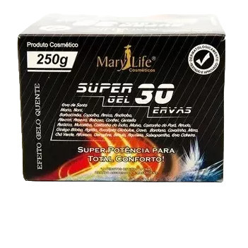 O Super Gel 30 Ervas - Mary Life Um gel que foi cuidadosamente desenvolvido para provocar na pele uma agradável sensação térmica quente-frio. O resfriamento da pele seguido de aquecimento intenso e prolongado auxilia na circulação e melhora os resultados de massagens para relaxamento corporal. Formulado com 30 extratos vegetais, dentre eles, a Cetella Asiática capaz de prevenir contra o aparecimento de celulite e a Arnica Montana, coadjuvante à sensação de fadiga muscular. Contendo 30 Tipos de ervas: Erva Santa Maria, Noni, Barbatimão, Copaíba, Arnica, Andiroba, Alecrim, Aroeira, Babosa, Confrei, Centella Asiática, Mutamba, Castanha Da Índia, Malva, Castanha Do Pará, Arruda, Ginko Biloba, Agrião, Eucalipto Globulus, Cravo, Bardana, Cavalinha, Mirra, Chá verde, Alfavaca, Gengibre, Bétula , Aquileia , Salsaparrilha , Erva Cidreira.
