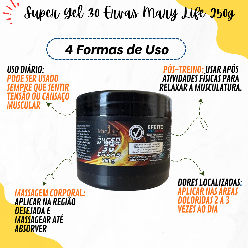 Super Gel 30 Ervas Mary Life 250g Gel Massageador Relaxante Corporal Refrescante