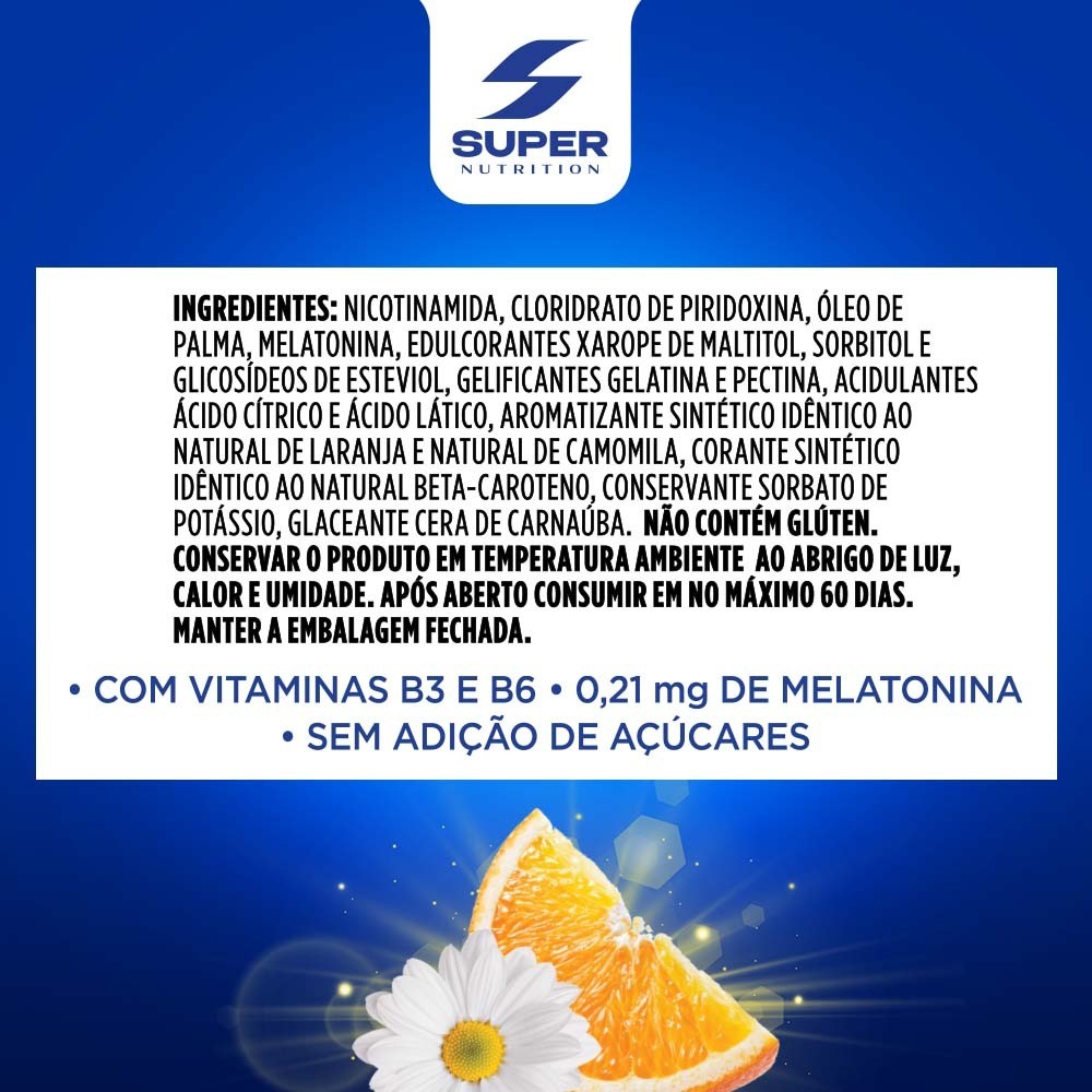 A primeira melatonina gummy do Brasil, com vitamina B3 e B6. É um suplemento em bala mastigável: prático, gostoso e pensado para sua rotina noturna. Com textura macia, sabor de laranja e extrato de camomila, sem adição de açúcar. Cada pote contém 60 unidades para acompanhar suas noites.