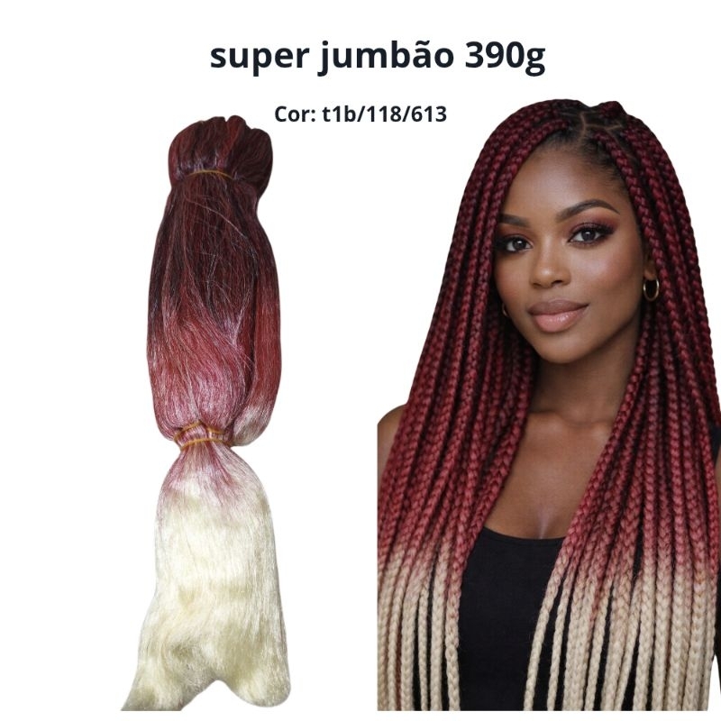 SUPER JUMBÃO MARCA: CHEREY PESO: 390G COMPRIMENTO: 60CM FECHADO 120CM ABERTO PARA BOX BRAIDS 2 PACOTES FAZ A CABEÇA TODA. FIBRA SEDOSA , CORES VIBRANTES TOQUE MACIO, FACIL DESEMBARAÇO IDEAL PARA : BOX BRAIDS FULANI BRAIDS NAGO ALIMENTADA GODDESS BRAIDS GYPSY BRAIDS E PENTEADOS EM GERAL.
