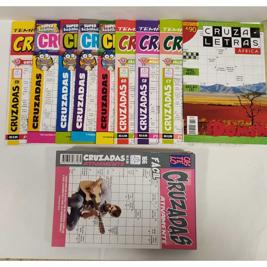 Nesse SUPER KIT você recebera. 20 revista de cruzadas sortidas sem repetição 20 revistas de cripto sortidas sem repetição 20 revistas de caça palavras sortidas sem repetição 20 revistas de numerix sortidas sem repetição Aumente seu nível de conhecimento através das revistas de passatempos , ótimo passatempo para toda a família .