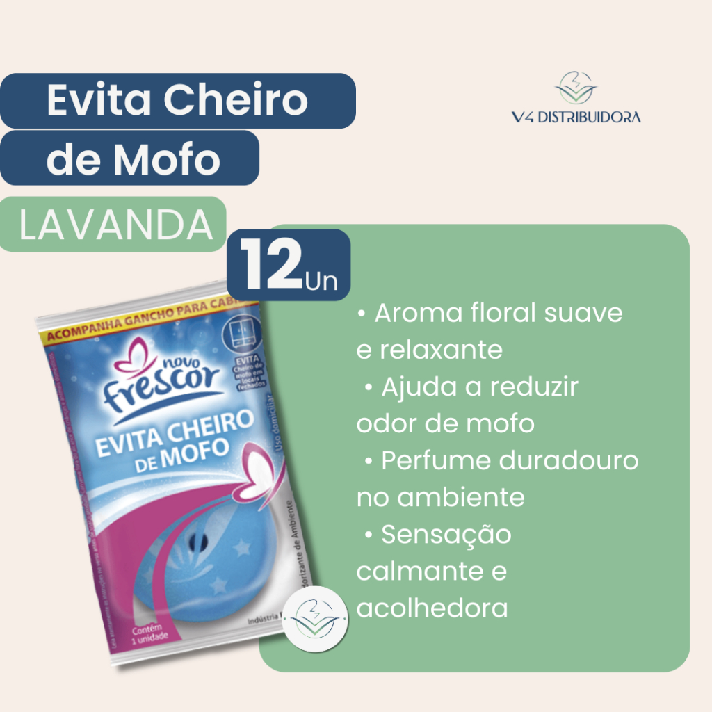 O Evita Cheiro de Mofo Novo Frescor é ideal para uso em gavetas, armários, closets, sapateiras, cômodas e outros ambientes fechados. Ajuda a reduzir odores de mofo e pode auxiliar no controle de insetos como traças e baratas, enquanto perfuma suavemente o ambiente. CONTEÚDO DA EMBALAGEM: Opção com 6 unidades OU 12 unidades Cada unidade contém 20 g de pastilha e acompanha ganchinho para cabideiro. FRAGRÂNCIAS DISPONÍVEIS: Lavanda, Talco e Citrus. INSTRUÇÕES DE USO: • Retire o produto da embalagem. • Utilize o suporte plástico com gancho para pendurar no cabideiro, se desejar. • Posicione no local desejado e deixe agir continuamente. PRECAUÇÕES E SEGURANÇA: • Manter fora do alcance de crianças e animais domésticos. • Não expor ao sol ou a temperaturas acima de 35 °C. • Não reutilizar a embalagem vazia. • Lavar as mãos após o manuseio. • Em caso de contato com os olhos, lavar com água em abundância. • Em caso de ingestão, não provocar vômito e procurar atendimento médico levando a embalagem. OBSERVAÇÃO IMPORTANTE: Na opção "Variadas", as fragrâncias serão enviadas conforme disponibilidade de estoque.