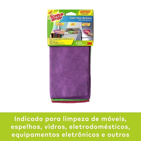 Remove pó e auxilia na remoção de manchas das superfícies 3 cores diferentes, um para cada comodo da casa Resiste até 200 lavagens na máquina com cloro Segundo testes de resistência à lavagem realizados em laboratório externo (norma ISO 6330:2012, Ciclo 3N – com adição de cloro) na data de 06/03/2019 O Super Pano Multiuso Scotch-Brite é indicado para limpeza de móveis, espelhos, vidros, objetos com acabamento cromado, eletrodomésticos, computadores, equipamentos eletrônicos e outros. Remove pó e auxilia na remoção de manchas das superfícies. Várias cores para facilitar sua escolha por ambiente e limpar todos os cômodos da casa. Utilize umedecido ou com produtos de limpeza de sua preferência para remoção de sujeiras mais difíceis. Sua alta resistência permite lavá-lo manualmente em tanque ou em máquina de lavar roupa, resistindo até 200 lavagens na máquina com cloro.