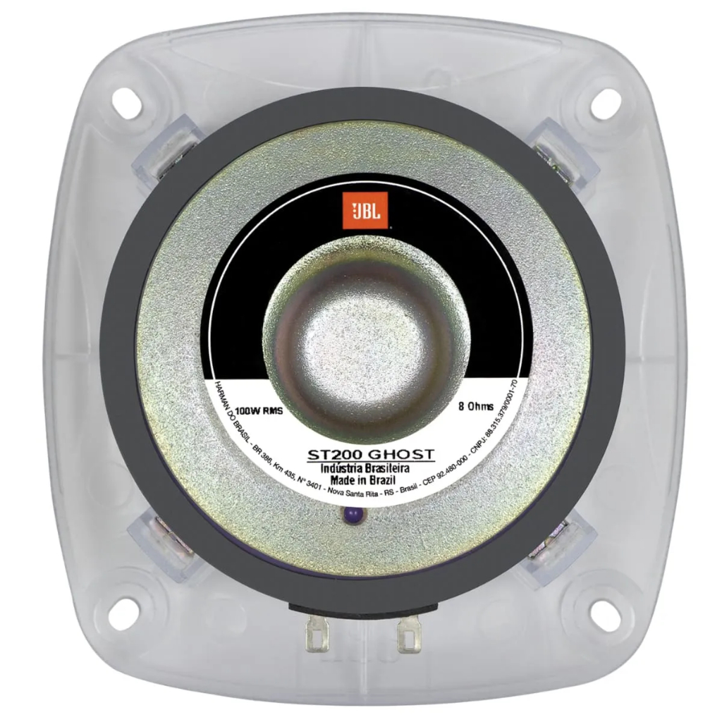 O super tweeter ST 200 GHOST é a escolha ideal para quem busca alta eficiência e baixa distorção na reprodução das altas frequências. Projetado para sistemas de PA, mini trios automotivos e reforço de som, ele se destaca pelo seu desempenho e durabilidade. Sua base e difusor em alumínio garantem excelente dissipação de calor, enquanto o acabamento usinado e envernizado proporciona um design sofisticado. Com um ângulo de dispersão de 40x40 (HxV), o ST 200 GHOST cobre longas distâncias com precisão, entregando agudos de timbre agradável graças ao seu diafragma fenólico. Sua bobina de 46 mm, feita em kapton e enrolada com fio CCAW, suporta altas temperaturas, assegurando máxima eficiência e definição sonora em toda a sua faixa de reprodução. Com potência de 100W RMS e sensibilidade de 105 dB SPL, este super tweeter oferece excelente resposta de frequência entre 2.000 e 20.000 Hz. Além disso, seu conjunto magnético com anel de alumínio reforça a qualidade e a fidelidade do som, tornando o ST 200 GHOST a opção perfeita para quem busca potência e clareza nos agudos. - Especificações Gerais: • Modelo: ST200 GHOST • Potência: 100W RMS • PEAK (HPF): 200W • Impedância nominal: 8 Ohms • Resposta de Frequência do Sistema: 2.000 a 20.000 Hz • Sensibilidade: 105 dB SPL • Dispersão da corneta (H x V): 40 x 40 • Material do diafragma: Fenólico • Diâmetro da bobina: 46 mm • Material do fio da bobina: Cobre • Material da forma da bobina: Poliimida • Comprimento do fio da bobina: 2,9 m • Altura do enrolamento da bobina: 2,2 mm • Coeficiente de tem. do fio: 0,004 1/"C • Re: 6,0 Ohms • Densidade de fluxo do GAP: 1,1 T • Frequência mínima recomendada: 5000 Hz • Dimensões: 63 x 115 x 124 mm • Peso: 0,890 kg • Material do ímã: Ferrite de bário • Diâmetro x altura do ímã: 90 x 10 mm • Peso do ímã: 220 • Peso do conjunto magnético: 650 • Material da base e tampa: Plástico ABS • Volume ocupado do transdutor: 1 L • Número de furos para fixação: 4 • Tipo de conector: Soldável - Conteúdo da embalagem: • 01 x Super Tweeter ST200 Ghost JBL
