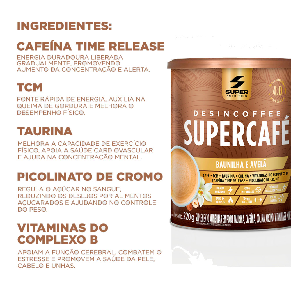 SUPERCAFÉ COM INGREDIENTES PREMIUM E FÓRMULA 4.0 MAIS SABOR E MELHOR PERFORMANCE CAFÉ • TCM • TAURINA • SEM AÇÚCAR • ADOÇADO COM STÉVIA • CAFEÍNA TIME RELEASE • COLINA • MINERAIS • PICOLINATO DE CROMO • VITAMINAS DO COMPLEXO B Café, ingredientes premium e muito sabor de Baunilha e Avelã O novo Supercafé de Desincoffee é uma bebida revolucionária à base de café e conta com ingredientes incríveis, totalmente diferente de tudo que você já provou. Combina ingredientes premium em uma formulação exclusiva. Possui 100mg de cafeína por porção, além de 650mg de Taurina que auxilia no aumento do estado de alerta e na melhora da concentração. Permite fazer o que te move, e ir além. Tudo isso com muito, muito sabor e baixas calorias. Como você nunca viu em um café bulletproof. Experimente o café com Baunilha e Avelã que vai despertar o melhor de suas várias versões. MODO DE PREPARO: Dissolva 1 scoop (10g) em água quente (100 a 200 mL);Misture bem, e está pronto para consumir! RECOMENDAÇÃO DE USO: Consumir 1 dose ao dia ou conforme orientação do médico ou nutricionista. PERGUNTAS FREQUENTES Quando devo consumir o produto? Consumir até 2 vezes ao dia, ou conforme orientação profissional. O produto quebra jejum?Sim, embora o produto seja baixo em calorias, há um aporte nutricional que interfere no jejum. Contudo, é uma forma interessante de quebrar jejum devido aos benefícios de seus ingredientes, sem intervir em pico insulínico. Quais as contra indicações? Produto contra indicado para gestantes, lactantes e crianças. Pode ser consumido com café? Recomendamos o consumo apenas de acordo com o modo de preparo, para garantir o sabor e funcionalidade desejada. Posso misturar com leite? Recomendamos consumi-lo apenas com a diluição em água. Posso consumir todos os dias? Ou devo realizar pausas?O produto é um suplemento alimentar e não tem nenhuma relação com medicamentos, não é necessário realizar pausas no consumo, podendo ser de uso diário e contínuo para manutenção da saúde. Tenho sensibilidade com pré-treinos comuns. Posso usar mesmo assim?Recomendamos que converse com seu médico ou nutricionista. Possuo histórico de problemas cardíacos e/ou coronários. Devo tomar?Neste caso, devido as propriedades estimulantes do produto não recomendamos o uso. Pode ser usado como pré-treino?Sim, por conter suplementos voltados para aumento de resistência física, energia e foco, pode ser usado como pré-treino. Recomendamos no mínimo 30 minutos antes da atividade física. Posso preparar gelado?Sim, o produto solubiliza e mantém um ótimo sabor mesmo em água fria. O produto é vegano? É sem lactose?Não. Alguns ingredientes podem conter traços de leite. Tem diferença entre o DESINCOFFEE para o SUPERCAFÉ?Sim, o Supercafé traz a proposta de unir a funcionalidade do Desincoffee aliada a explosão de sabor.